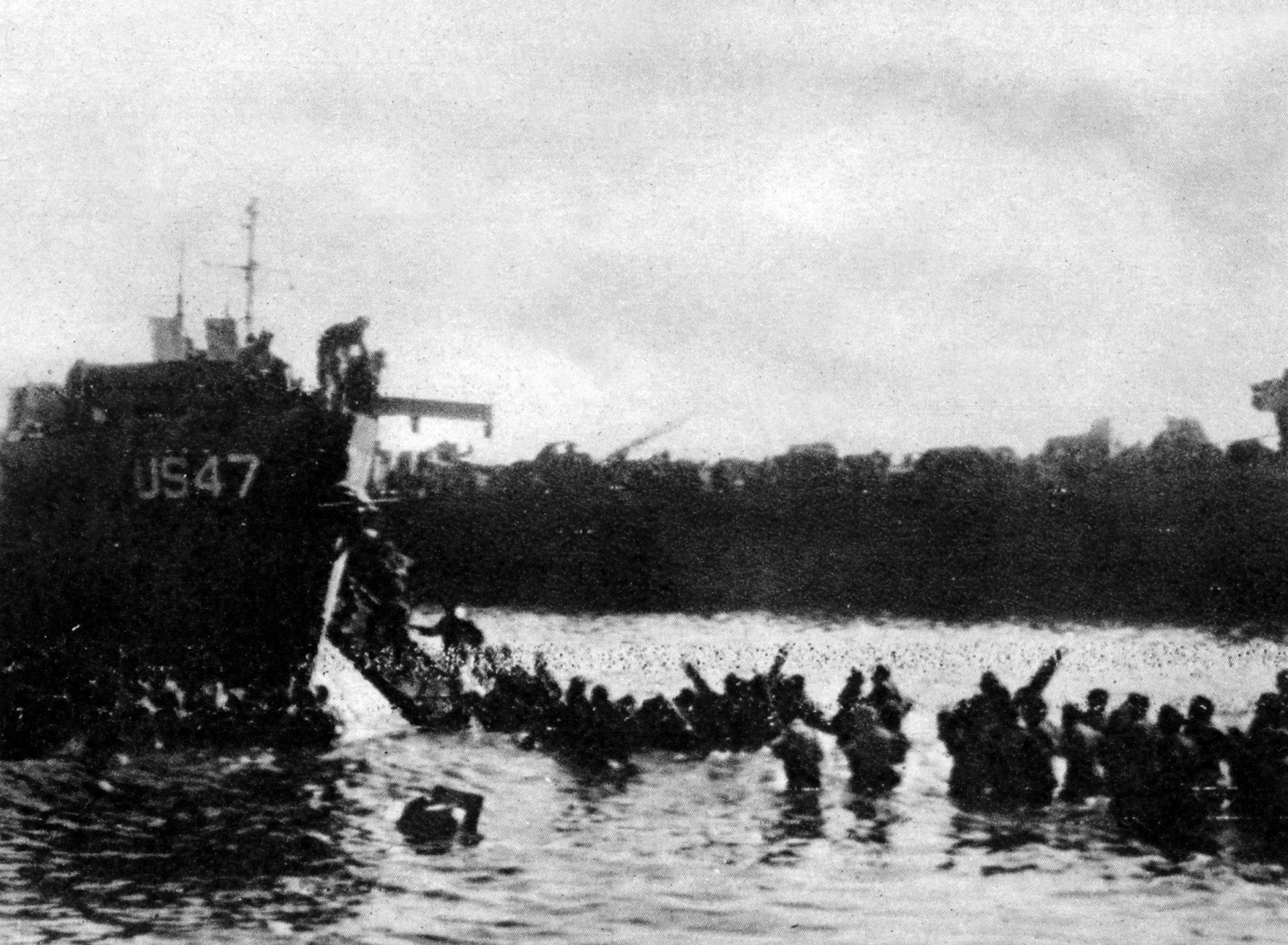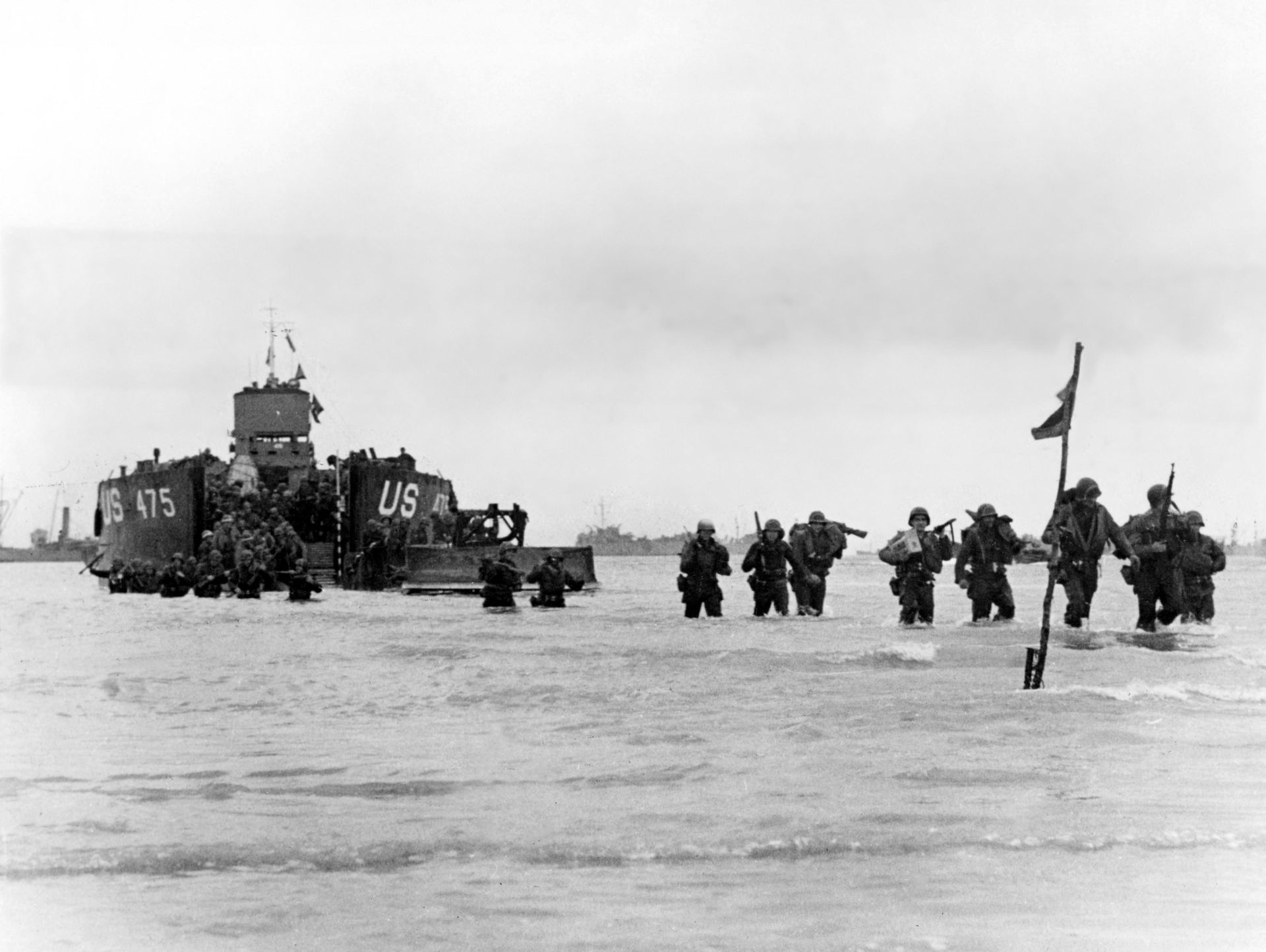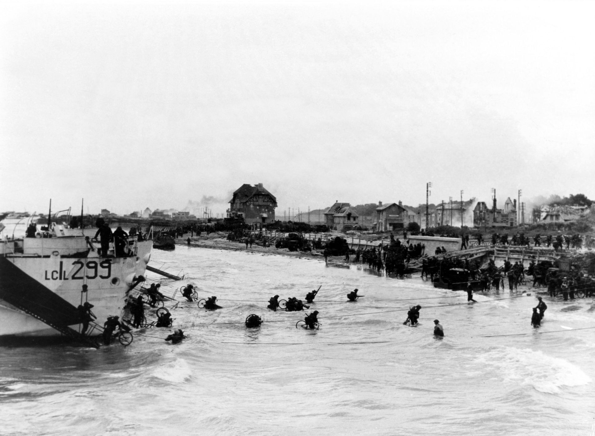 Aterrizaje en la playa de Utah, el 8 de junio de 1944. En la fotografía se pueden ver varios equipos y vehículos que descargan en las playa.