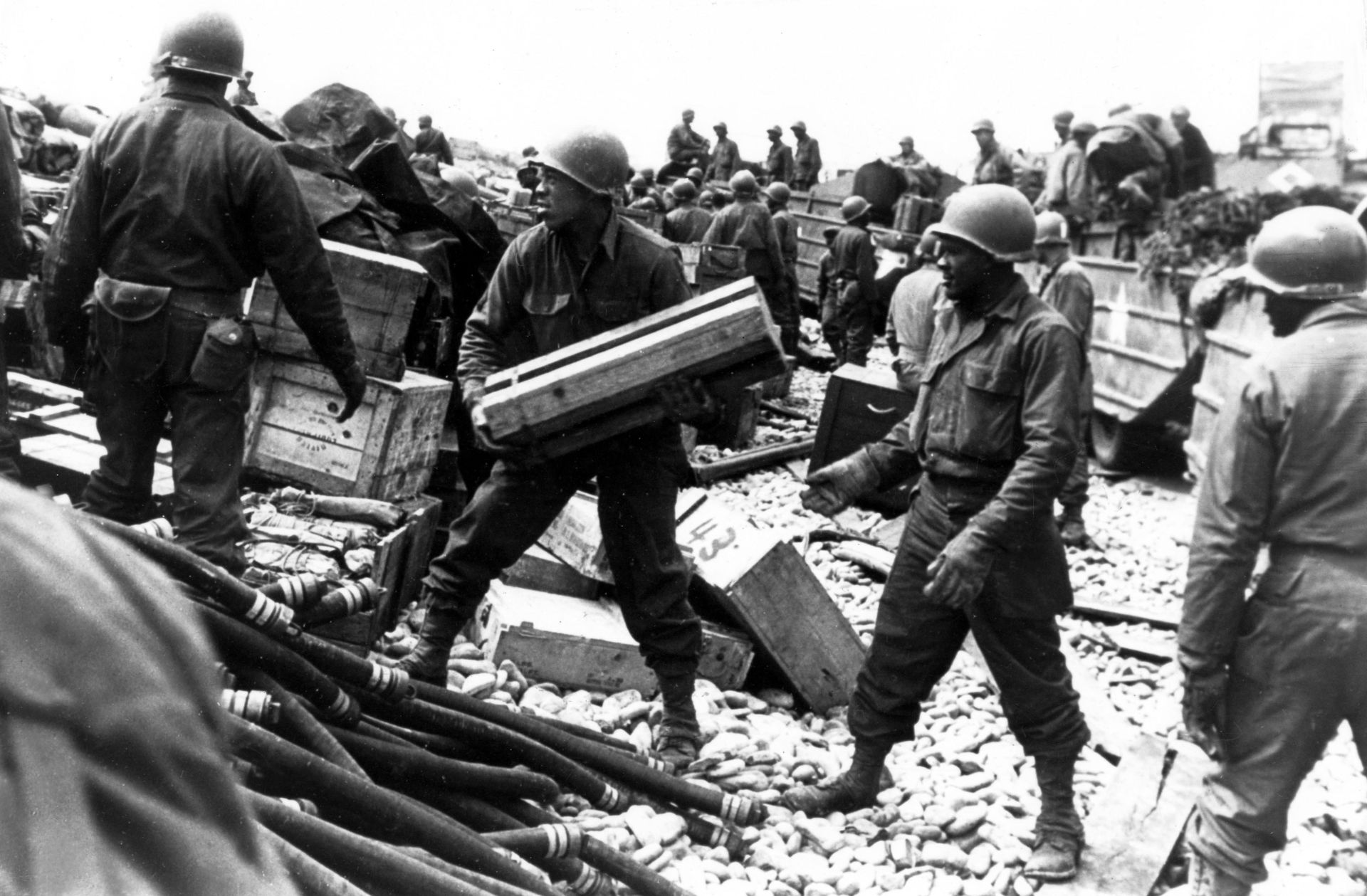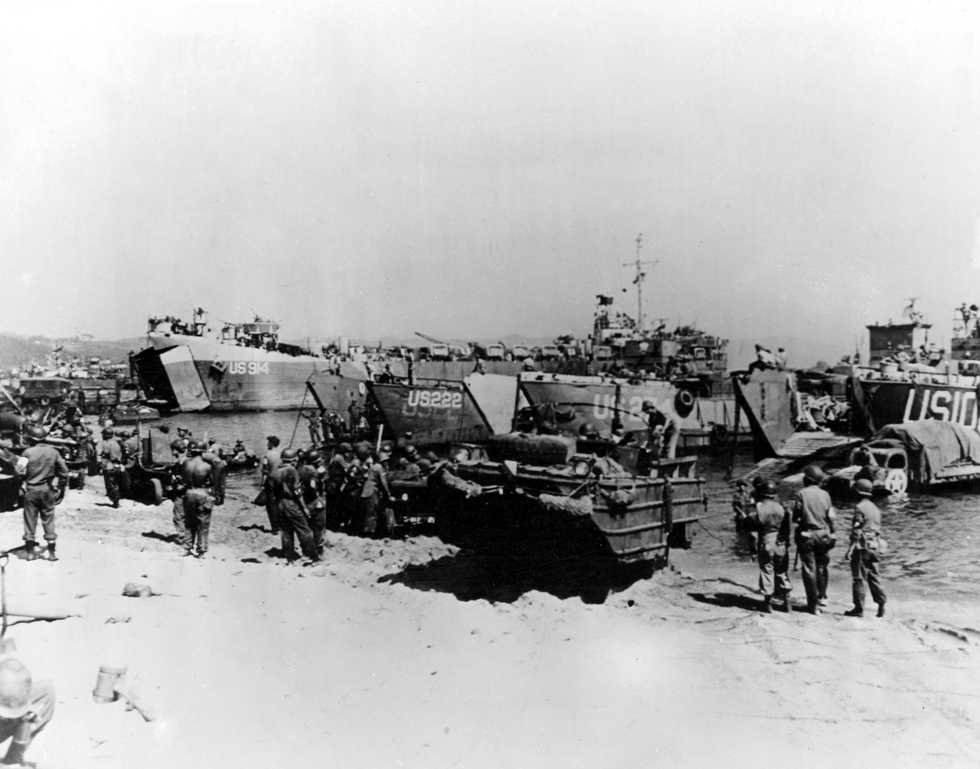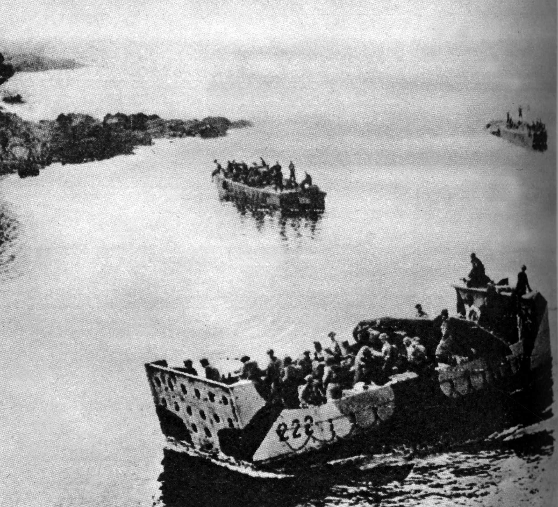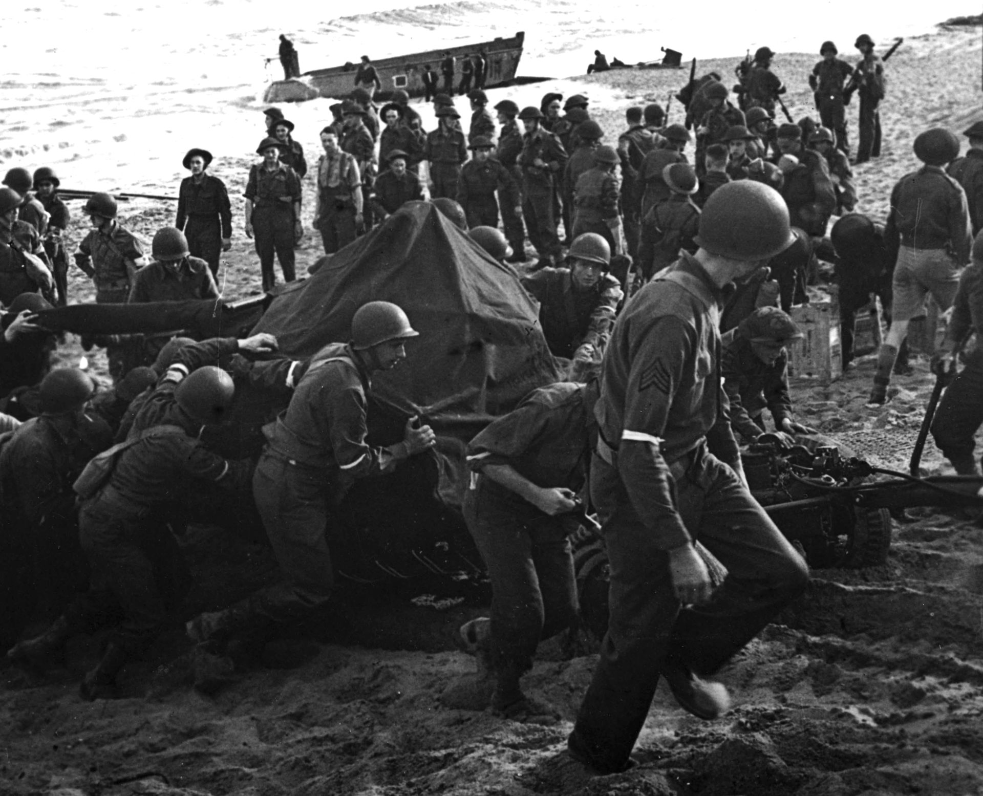 Aterrizaje en la playa de Utah, el 8 de junio de 1944. En la fotografía se pueden ver varios equipos y vehículos que descargan en las playa.