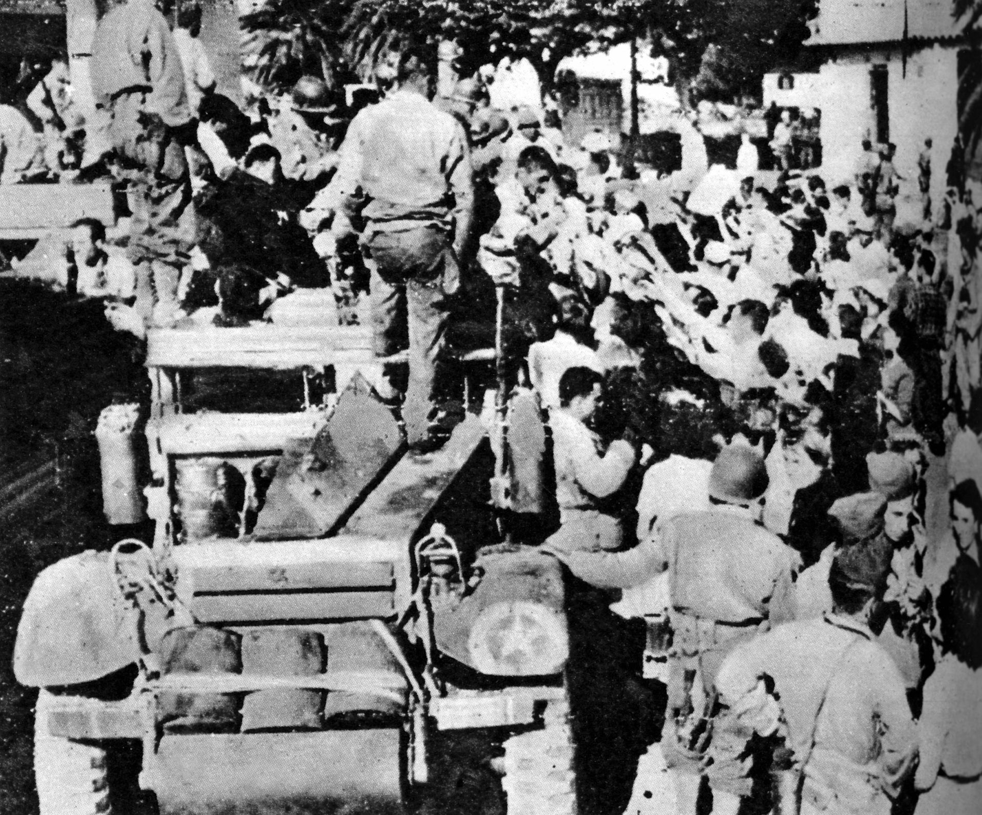 La fotografía de varios soldados americanos sobre un jeep, en la Place Vauban, detenido frente a una tienda relojes.