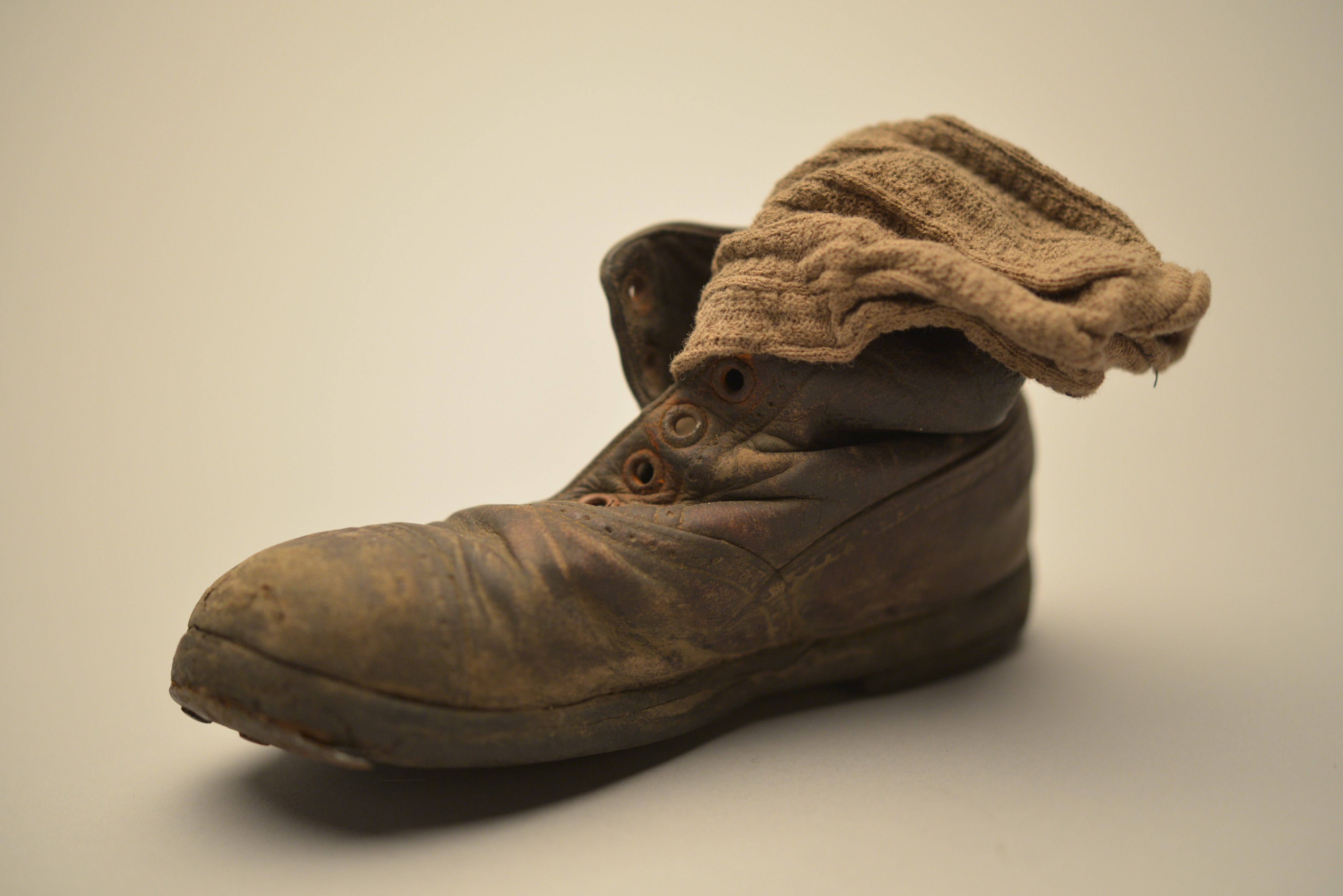 La exposición mostrará durante esta itineraria mundial más de 600 objetos originales, en su mayoría pertenecientes a la colección del Museo Estatal de Auschwitz-Birkenau.. En la imagen, un zapato y un calcetín de un niño.