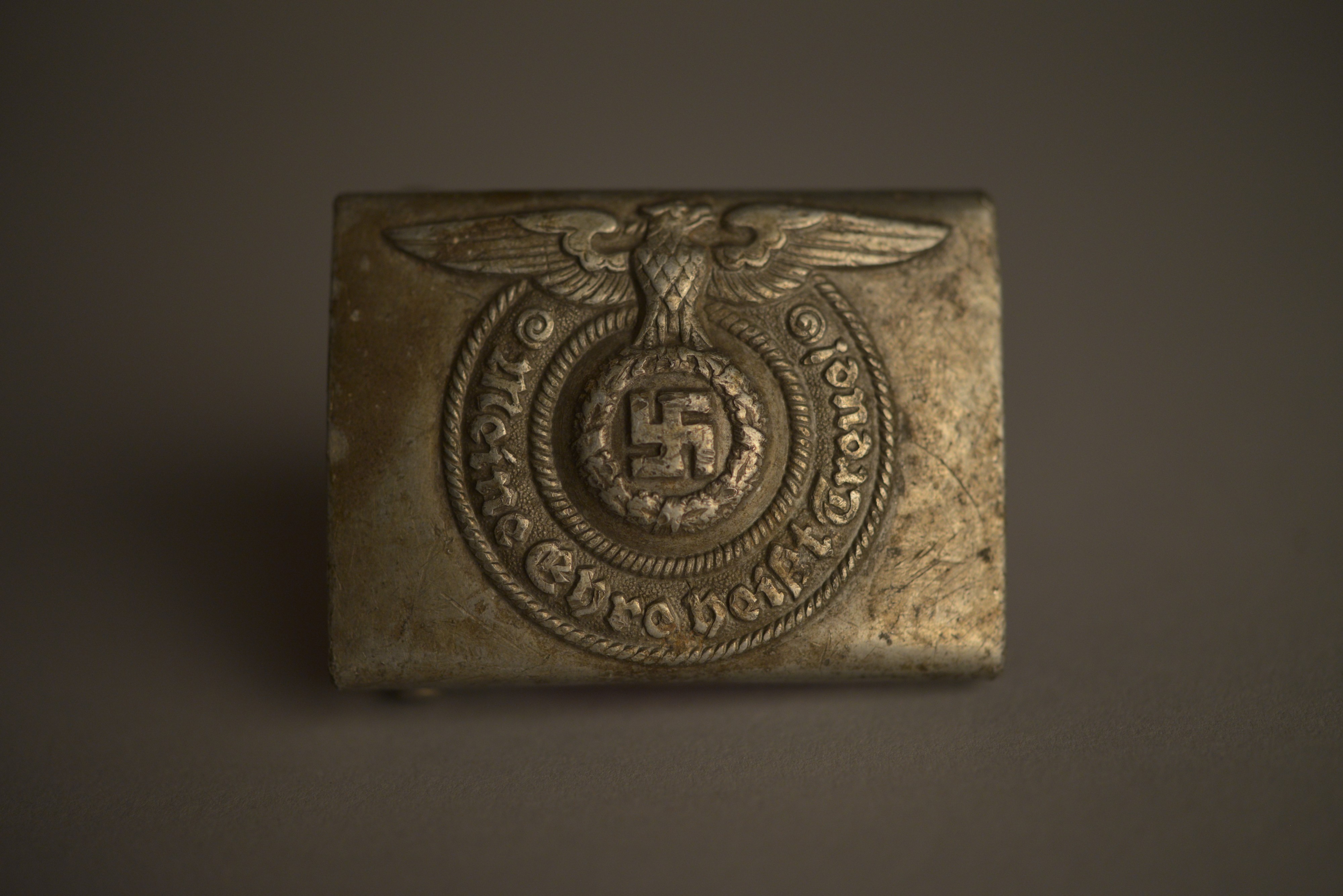 Algunos objetos mostrarán también el mundo de los verdugos, al recoger la realidad de los miembros de las SS, la fuerza ejecutiva ideológica del nazismo que creó y operó en el mayor de los campos nazis. En la imagen, la hebilla del cinturón de un uniforme de las SS