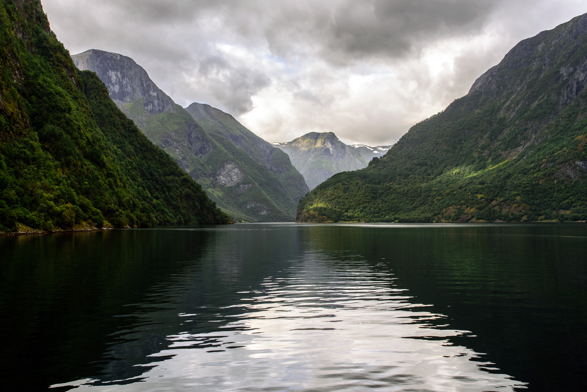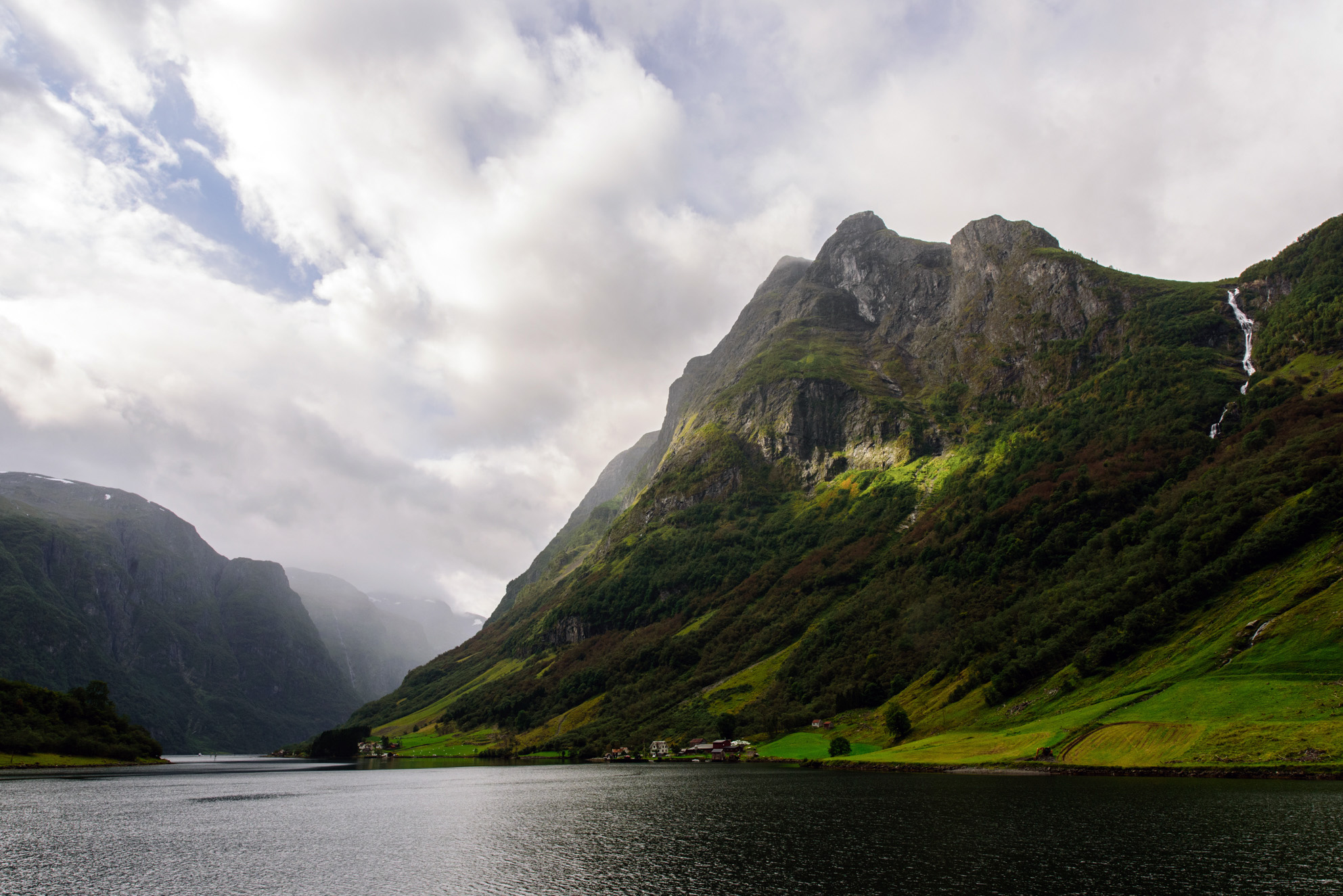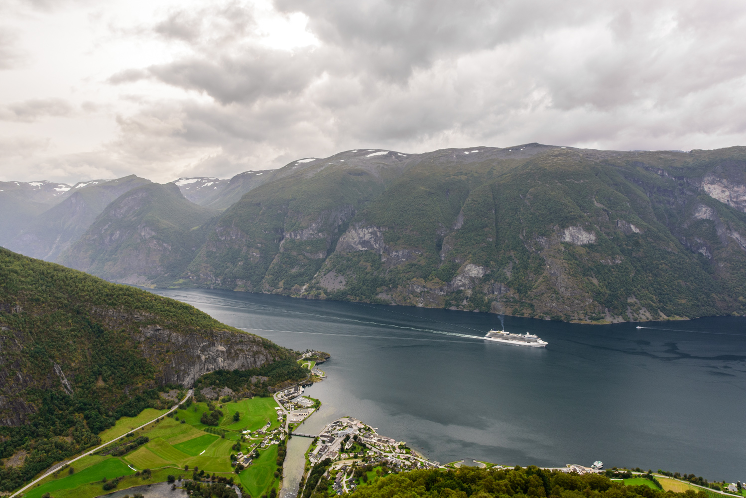 Una vista general del fiordo de Aurland, con el pueblo de Aurland en primer término, es el canal por el que navegaban los barcos vikingos en su época. Este canal conecta con el gran fiordo de Sogn y Gudvangen se encuentra a pocos kilómetros.
