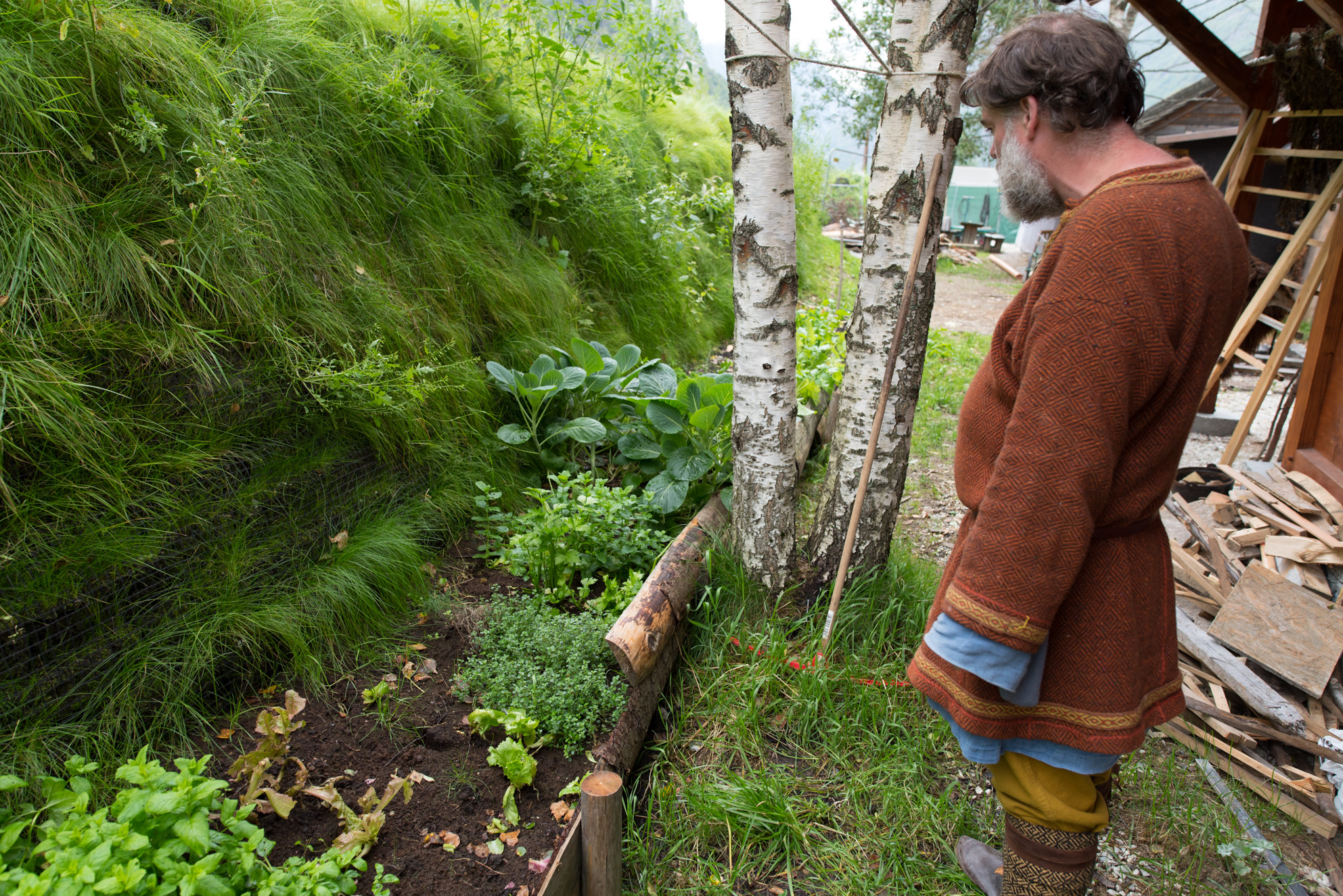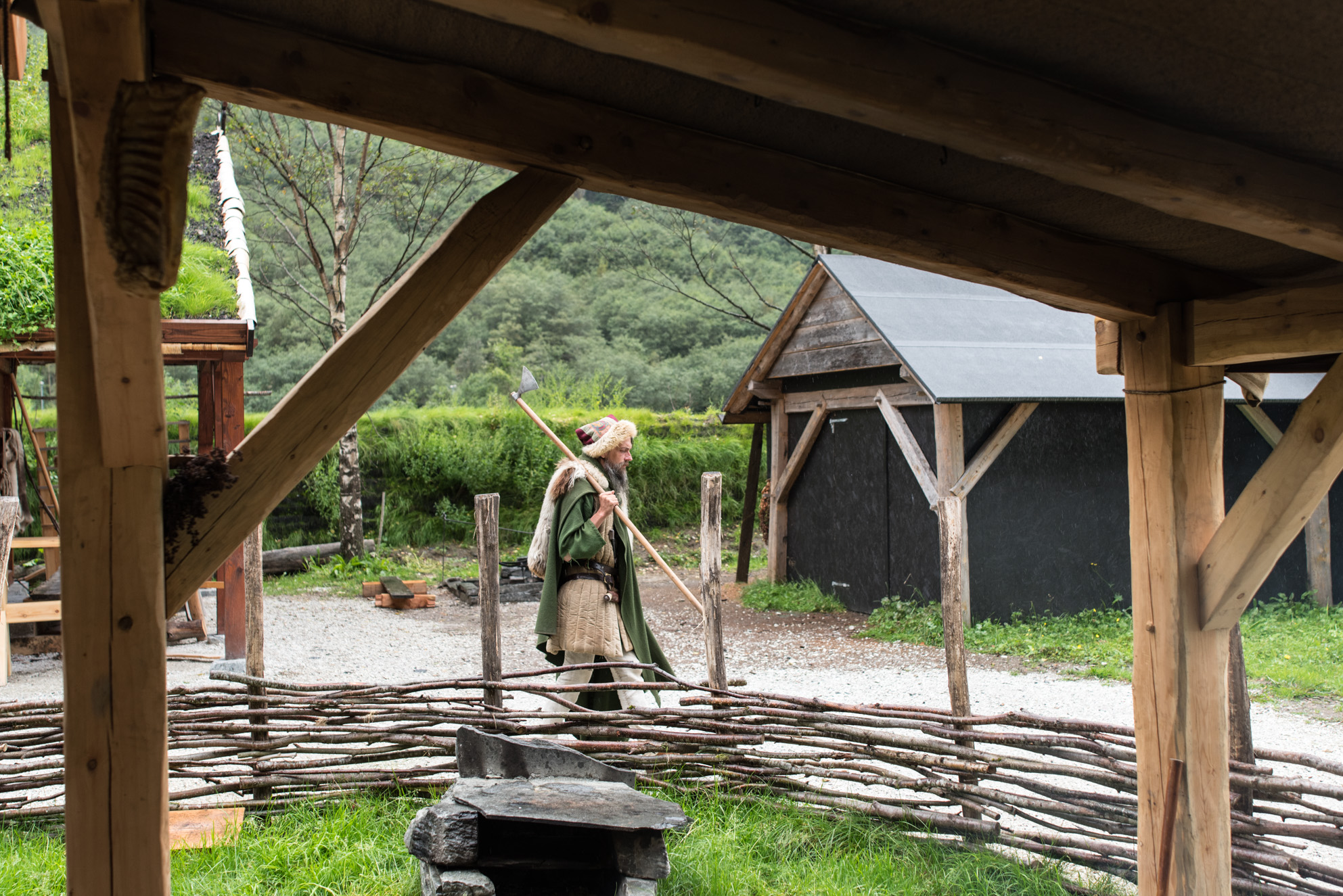 Karl, uno de los 'vikingos modernos' que vive en el poblado, pasea por sus caminos cargando una lanza.
