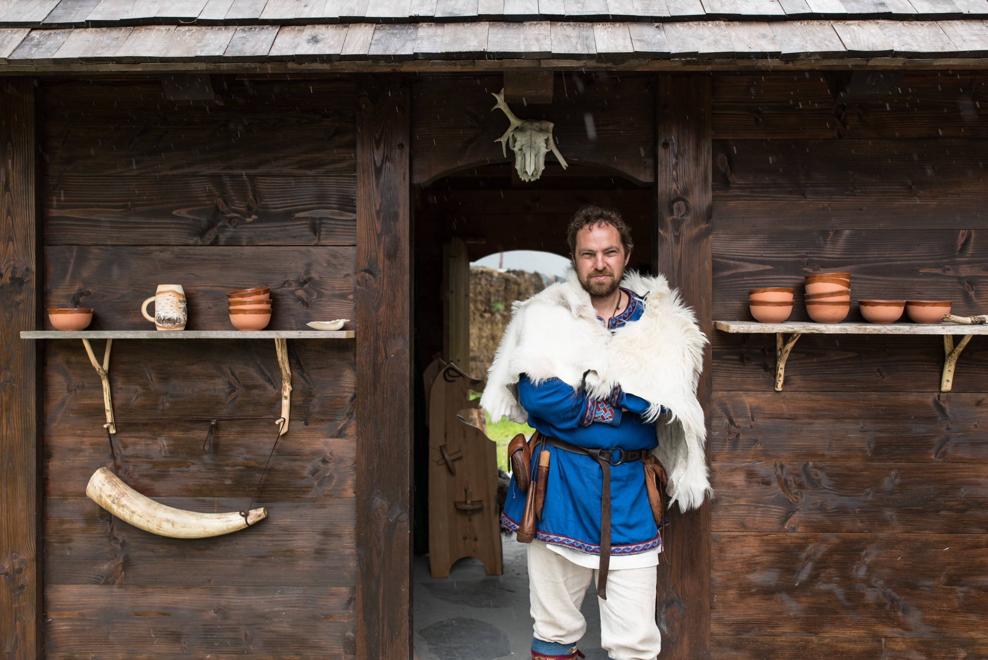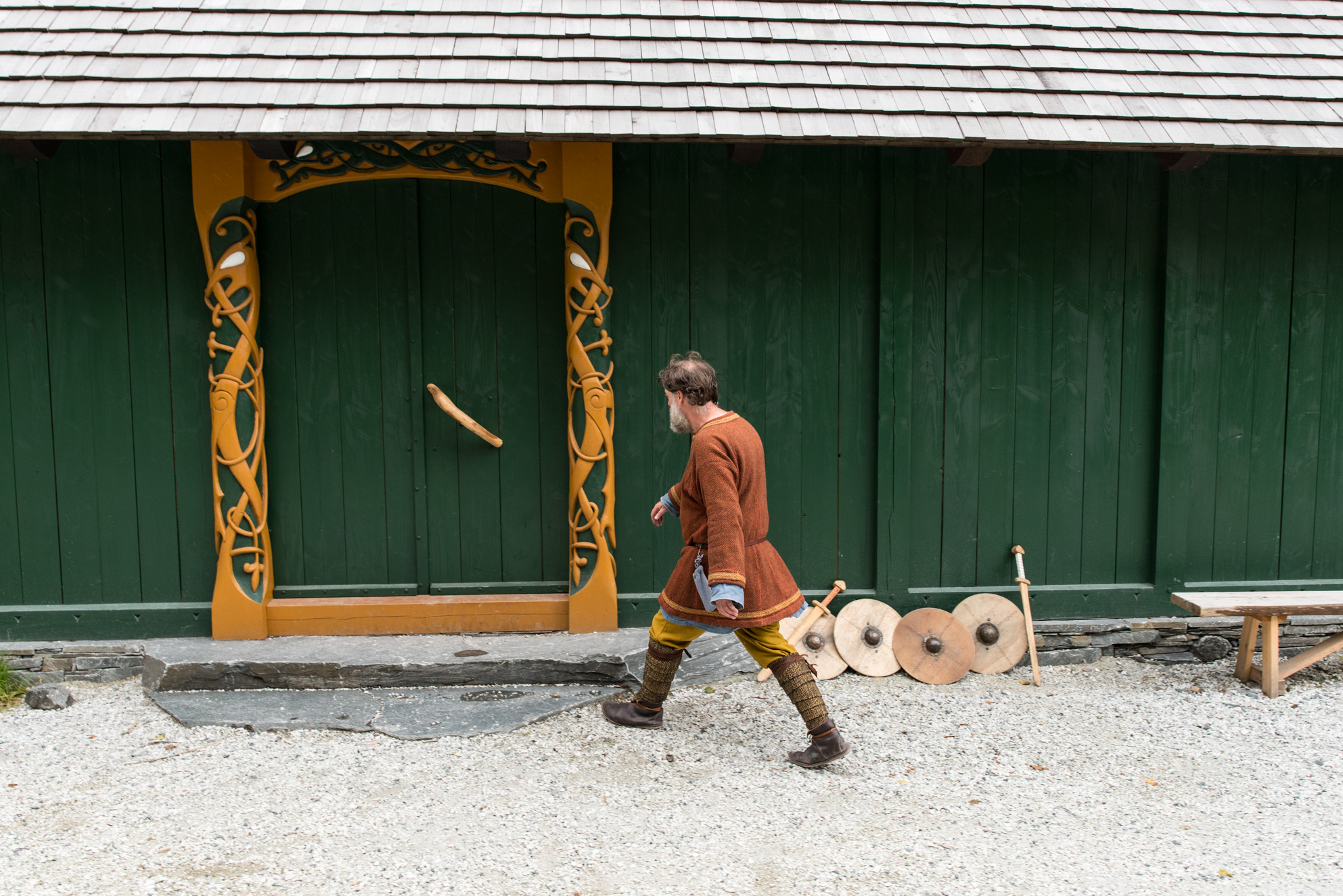 Mal Dickson, uno de los responsables del asentamiento vikingo actual se dispone a entrar en la casa más grande del poblado. Una estancia similar a un templo, con suficiente amplitud como para alojar a todos los vecinos del pueblo.