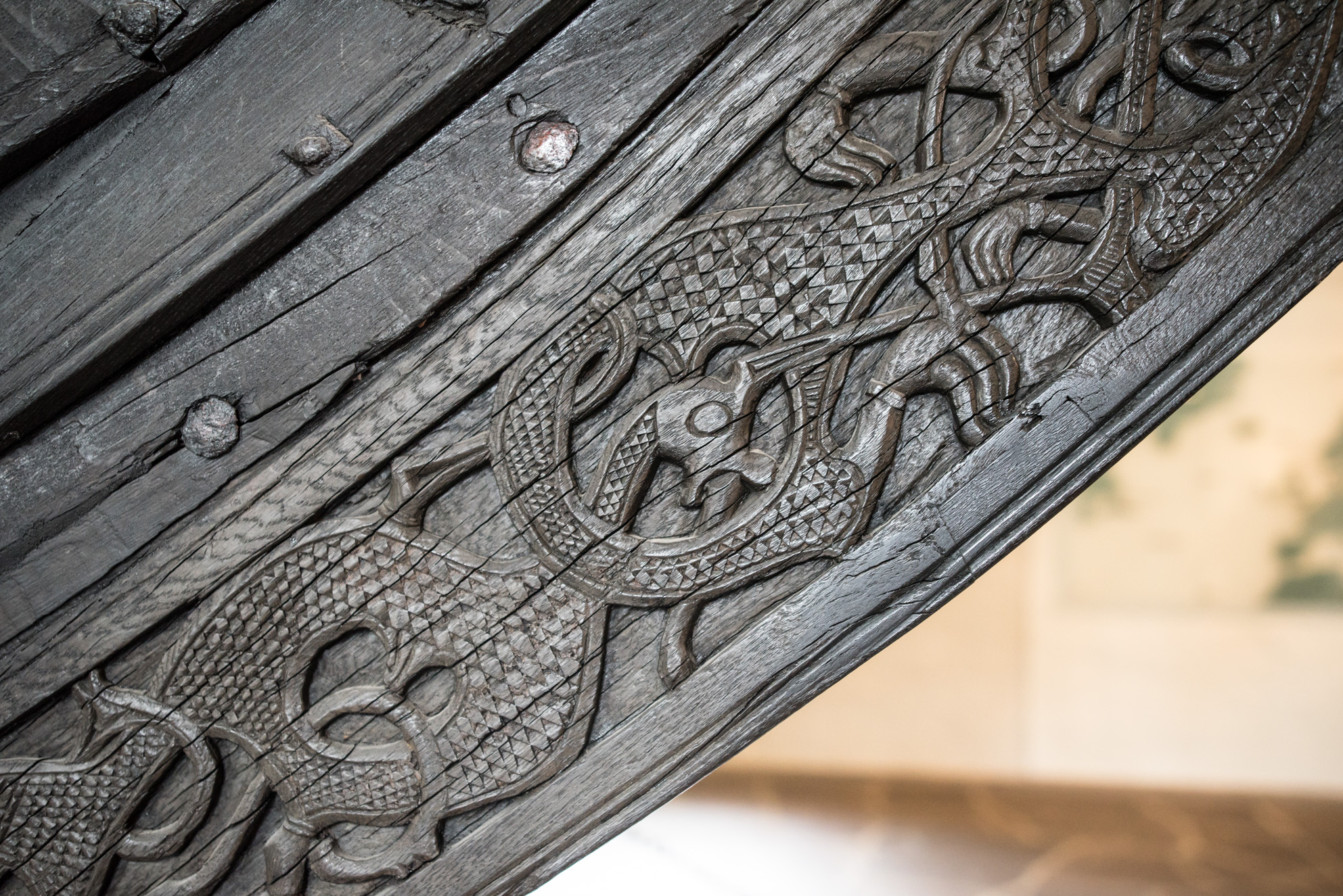 Esta embarcación está tallada con formas de serpientes, plantas o enredaderas que formaban parte de la decoración típica vikinga, muy presente en los relieves y dibujos decorativos de sus barcos.
