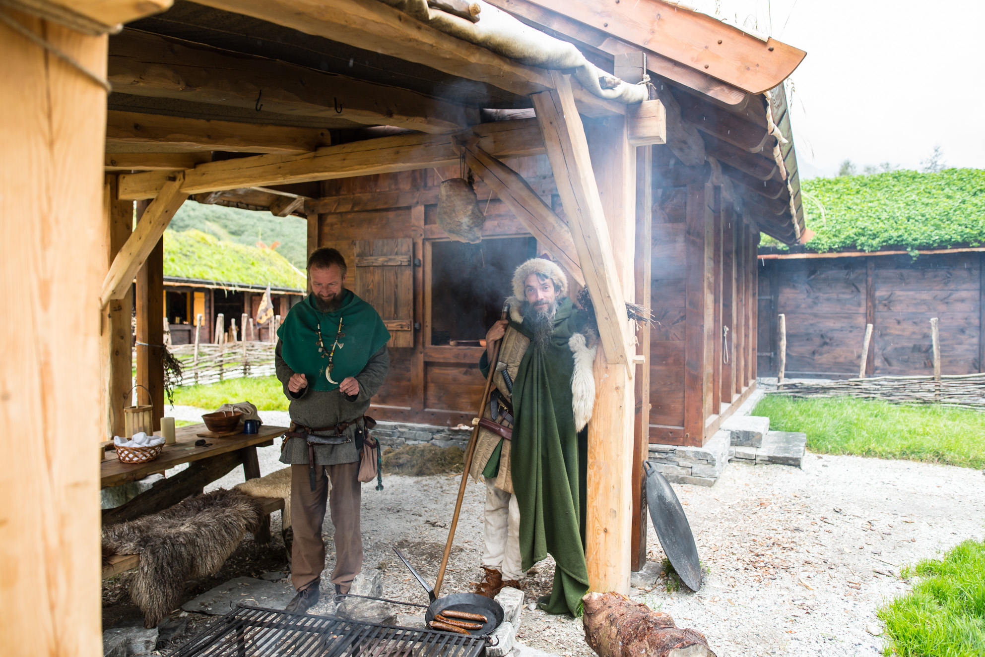 Dos de las personas que viven durante varios meses en este poblado moderno, vestidos de vikingos, esperan a que se calienten unas salchichas.