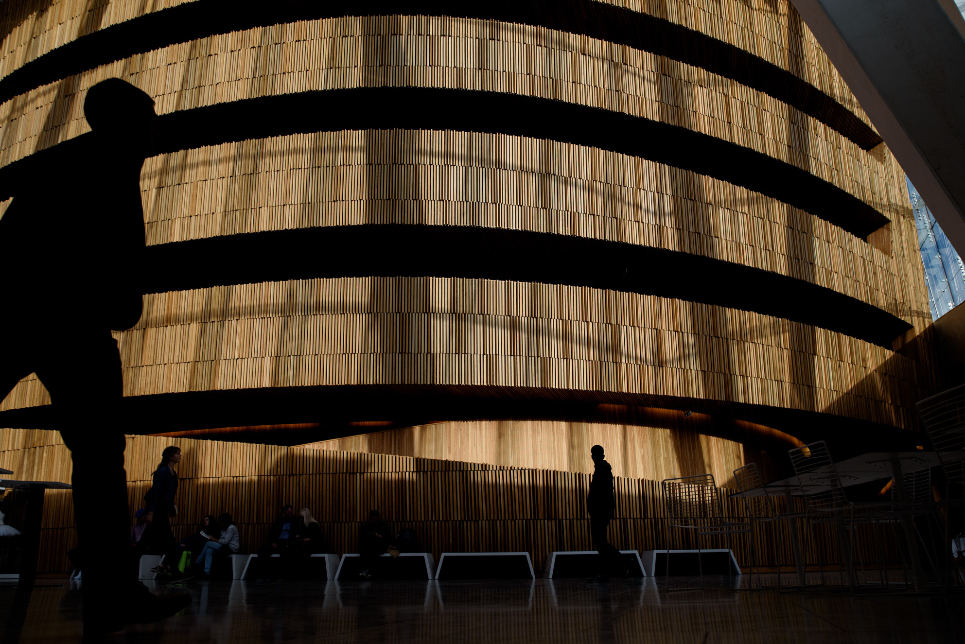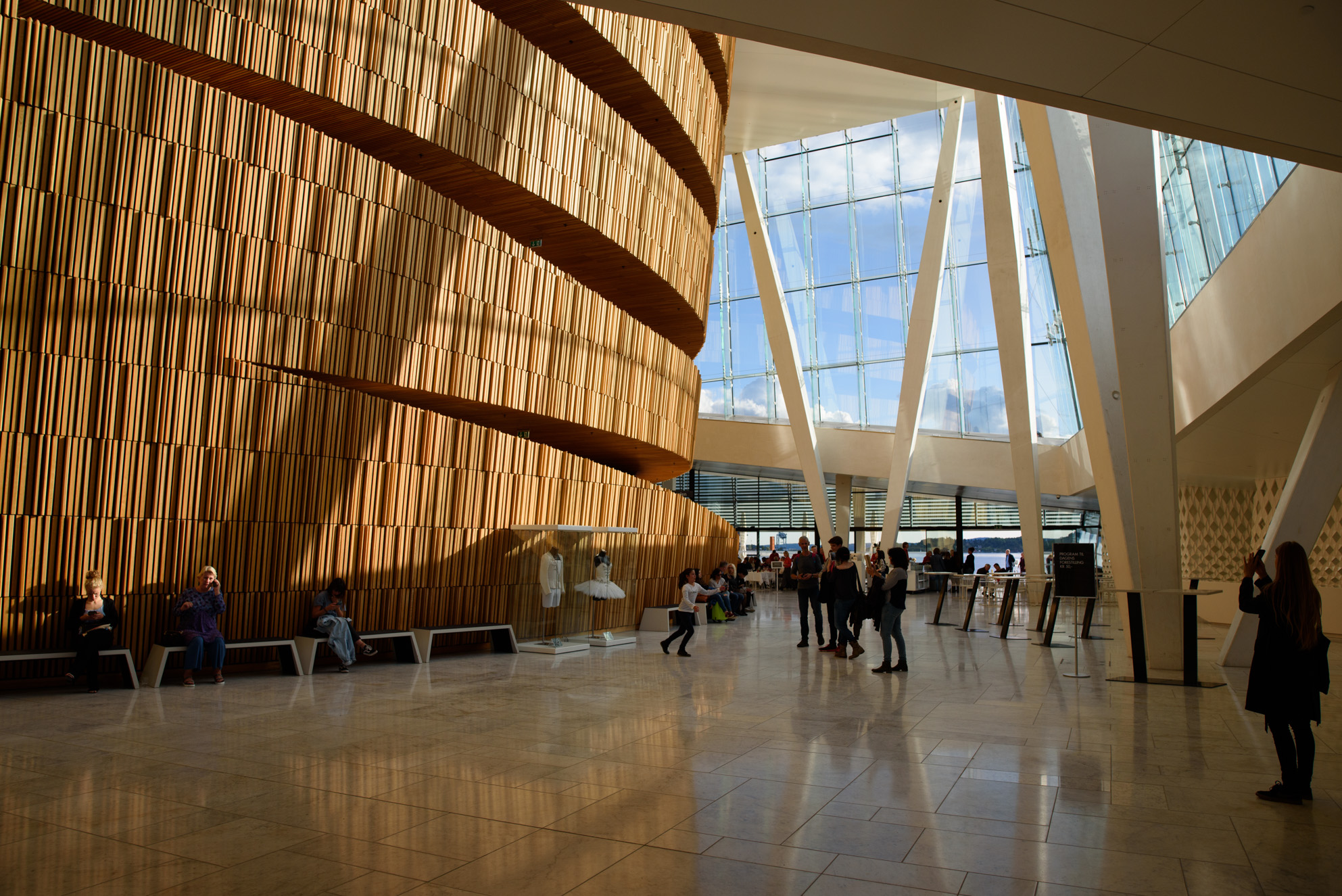 El espectacular interior, en este caso el hall, donde la gran cristalera deja pasar la luz. Sus enormes ventanas a ras del suelo facilitan que puedan verse los ensayos o las actividades que se desarrollan en el interior del edificio de la ópera de Oslo, que está construido fundamentalmente con madera de roble. El vestíbulo principal tiene forma de herradura, como tributo a los teatros clásicos de la antigüedad.