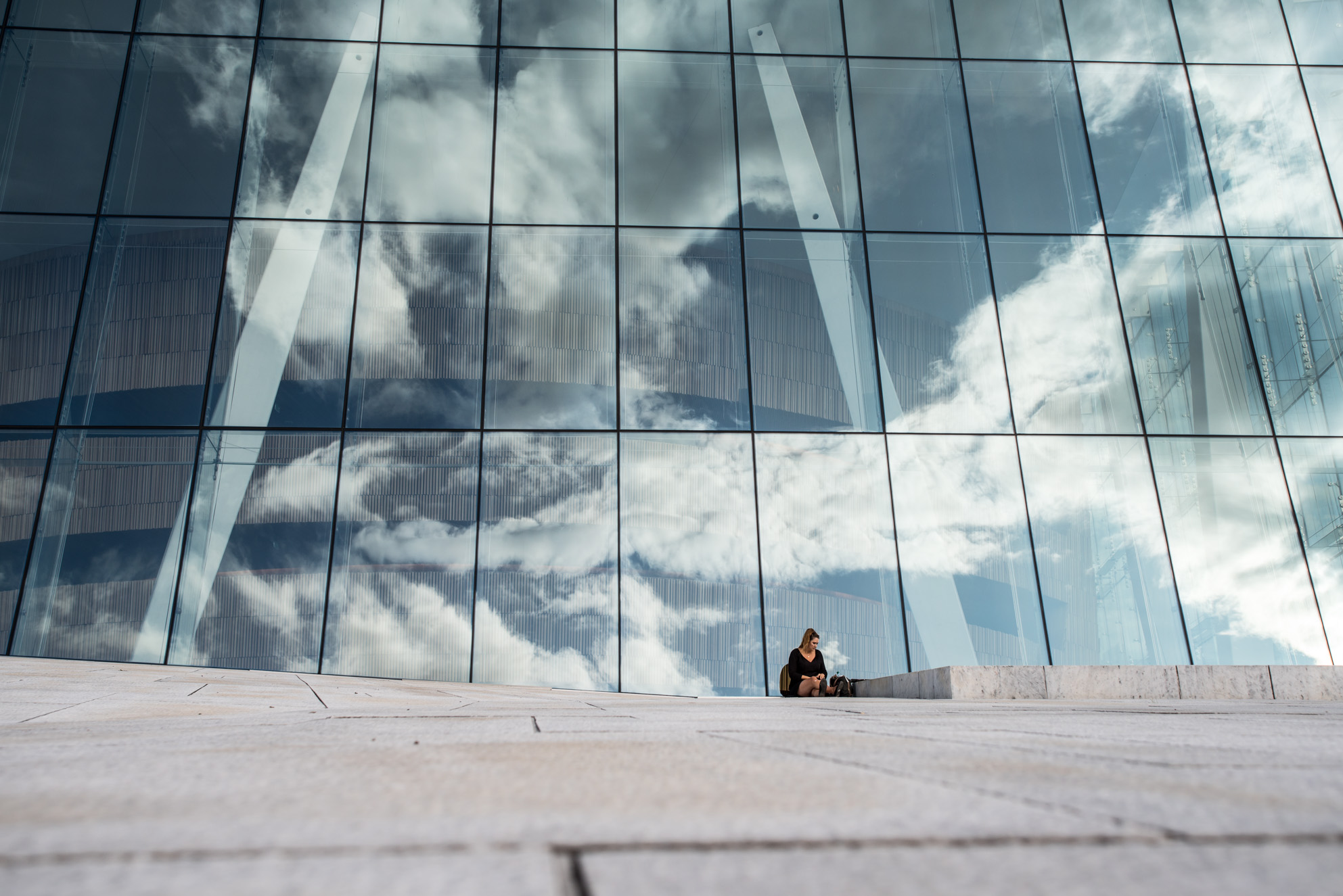 Una mujer permanece sentada recostada sobre la estructura de cristal que rodea gran parte del edificio de la ópera de Oslo.