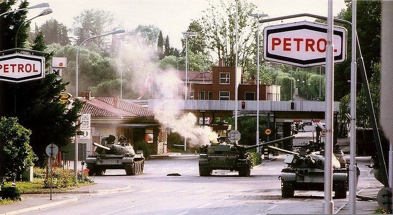 La Guerra de los Diez Días estalló con motivo de la toma de los pasos fronterizos yugoslavos por las tropas eslovenas y se extendió entre el 27 de junio y el 6 de julio. Murieron unas 80 personas, en su mayoría soldados del Ejército federal, y una docena de extranjeros, incluidos varios camioneros búlgaros. La ‘guerrita’ concluyó mediante un pacto entre Liubliana y Belgrado.