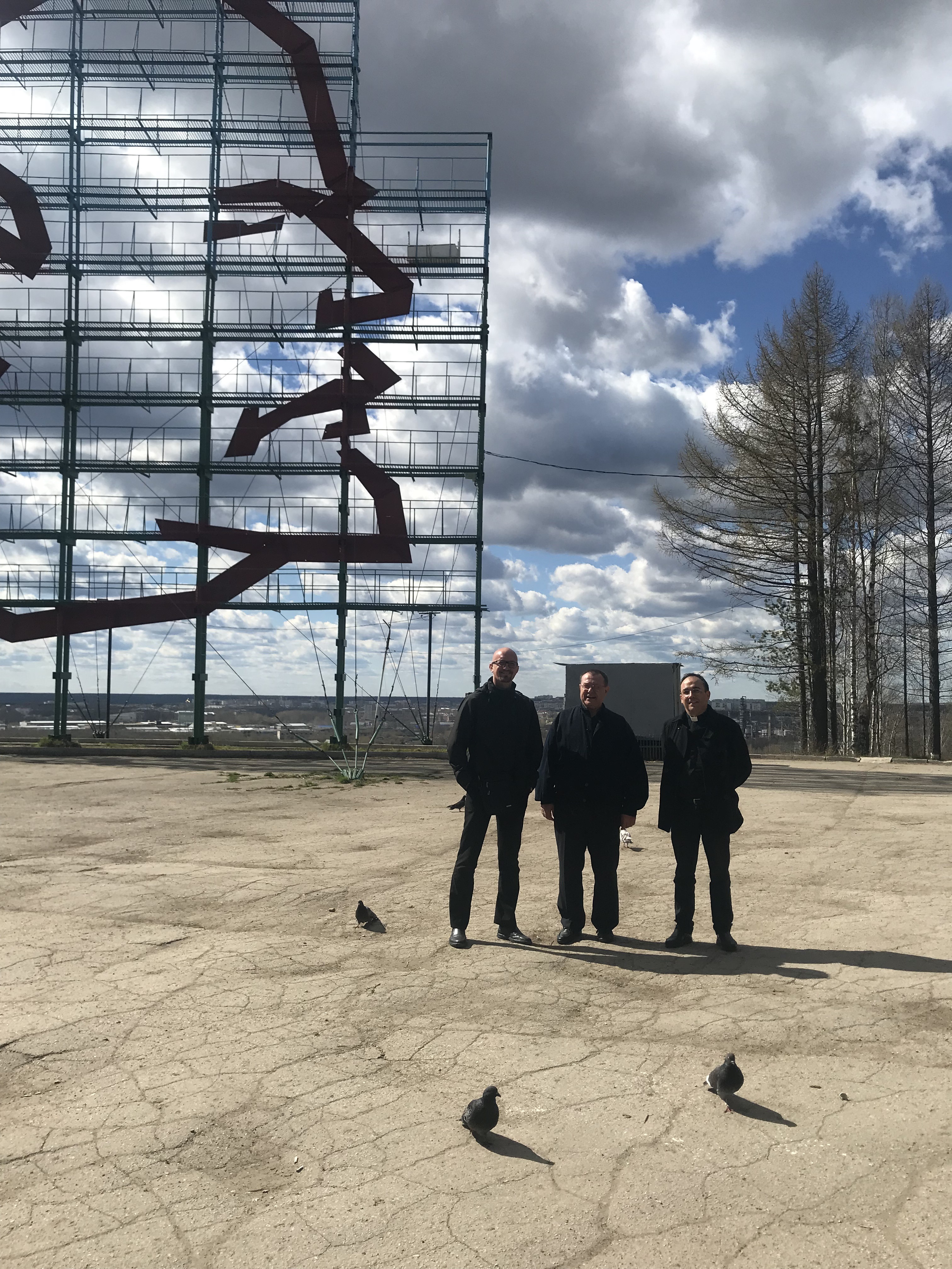 Delante de una obra que homenajea a Lenin, obras dispersadas por toda Rusia.