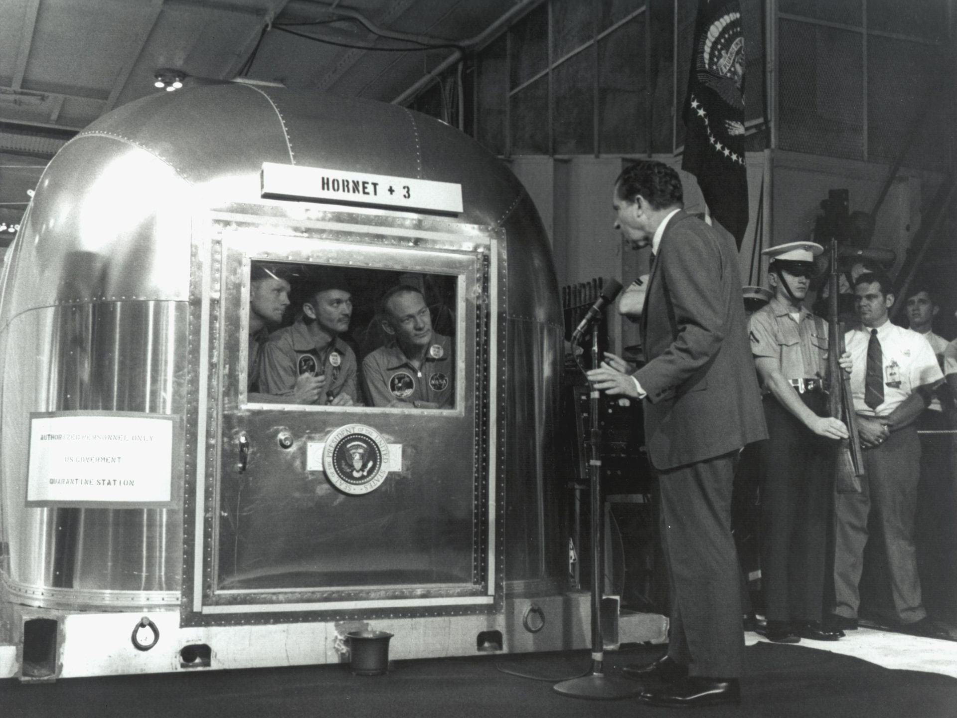 A su regreso a la tierra, los tres astronautas debieron pasar una temporada en cuarentena. En la imagen puede vérseles durante una visita del presidente Nixon.