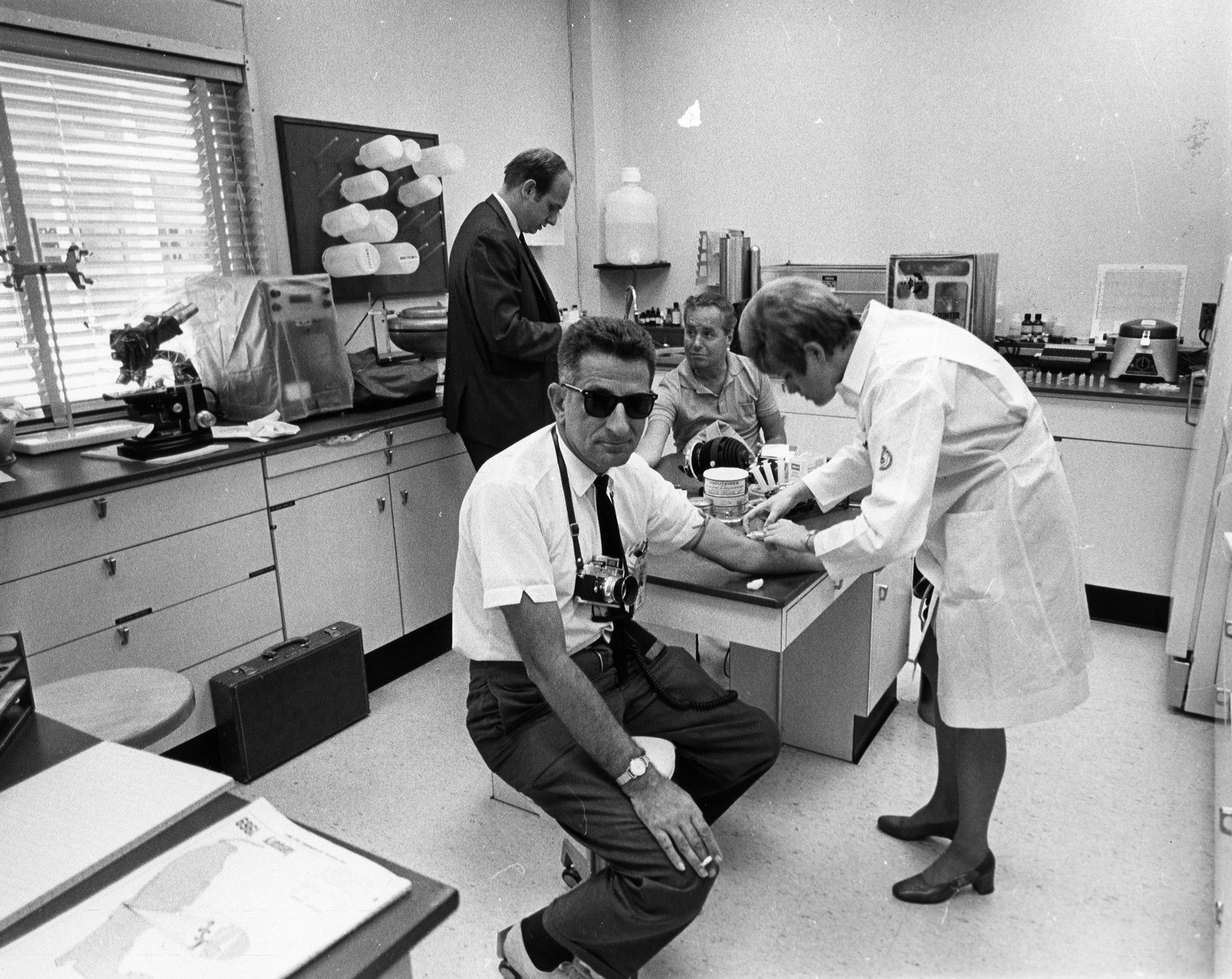 Como medida preventiva, el fotógrafo de la NASA Bill Taub también fue sometido a un periodo de semicuarentena. En la imagen se le ve en medio de unos análisis de sangre.