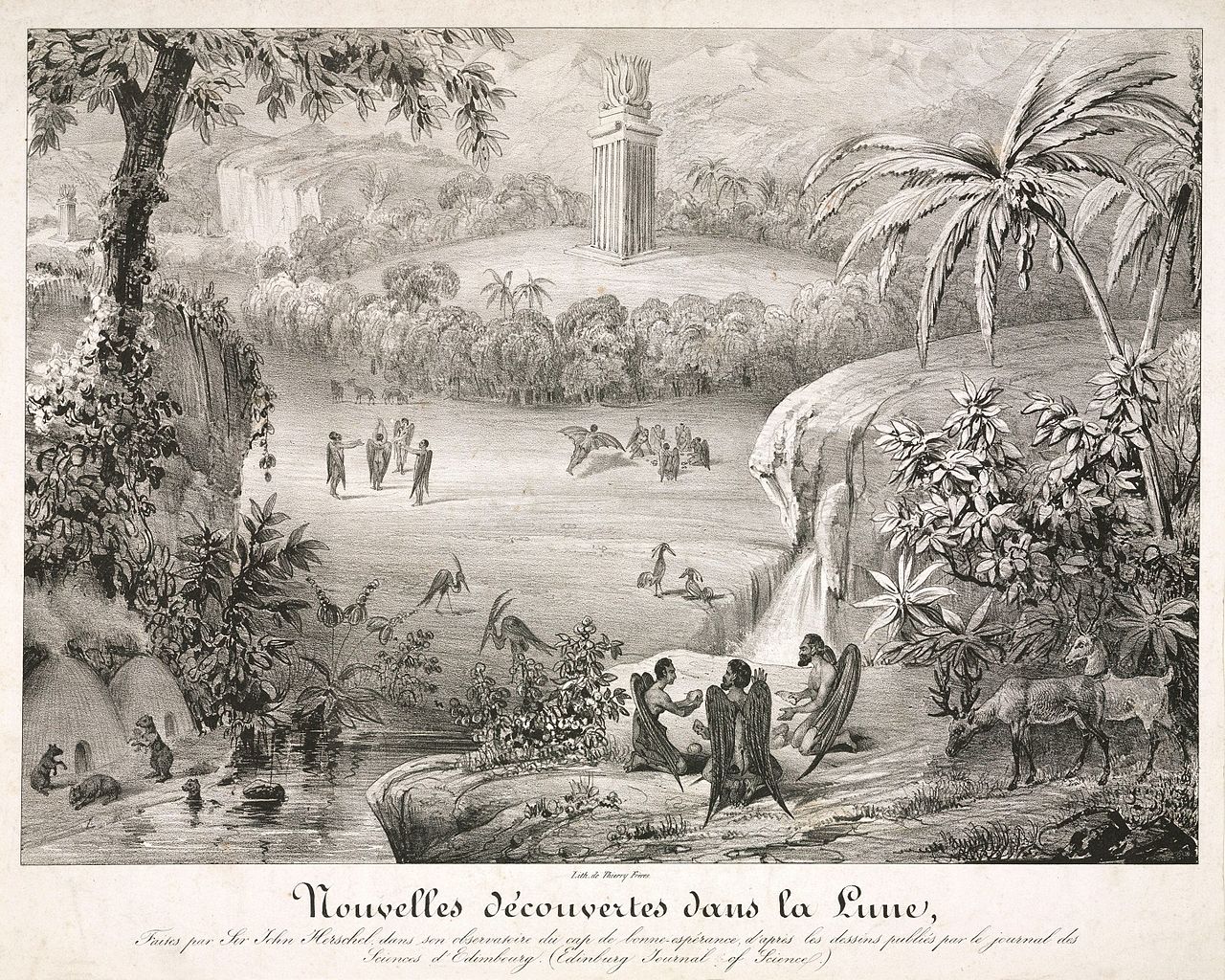 Bastante antes de que Orson Welles hiciera creer al mundo que una invasión alienígena amenazaba la Tierra, un periódico estadounidense engañó a la opinión pública con una de las farsas más famosos de la historia del periodismo. En agosto de 1835, el diario The New York Sun, que andaba aún en pañales, publicó una serie de seis artículos que contaban los últimos avances del astrónomo John Herschel. Recogían los asombrosos resultados que estaba arrojando el telescopio de Herschel construido en Sudáfrica, cerca de Ciudad del Cabo. Estas columnas estaban firmadas por Andrew Grant – aunque posteriormente se atribuyeron a Richard Adams Locke- y desvelaban al mundo el increíble descubrimiento de vida inteligente en la Luna. Por fin había pruebas de que no estábamos solos en el universo.