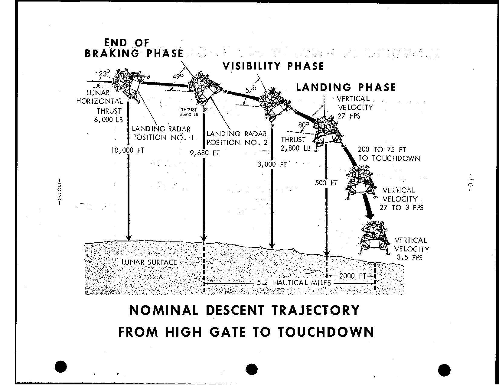 El Eagle se desacopló con los astronautas Neil Armstrong y Buzz Aldrin Neil en su interior de pie y sin asientos (33), mientras Michael Collins se quedó en el Columbia (34). Armstrong, a 15 kilómetros (35) de la superficie de la Luna empezó a pilotar la nave frenando su descenso muy lentamente a sólo 3 metros/segundo (36), la velocidad con la que se mueve un ascensor de un centro comercial (37). En la anterior misión del Apollo 10 (38) se había llegado hasta este punto. A partir de ahora, todo lo que se hizo sería por primera vez. Armstrong decidió sobrevolar la superficie mientras descendía para buscar un buen lugar para el aterrizaje. Fue guiado por la estación de seguimiento de Fresnedillas (39), en España. Con el combustible consumido en un 90% (40) y a 1,70 metros (41) de la superficie, pararon el motor y se dejaron caer suavemente. "Houston, aquí base Tranquilidad (Tranquility). El Águila se ha posado".