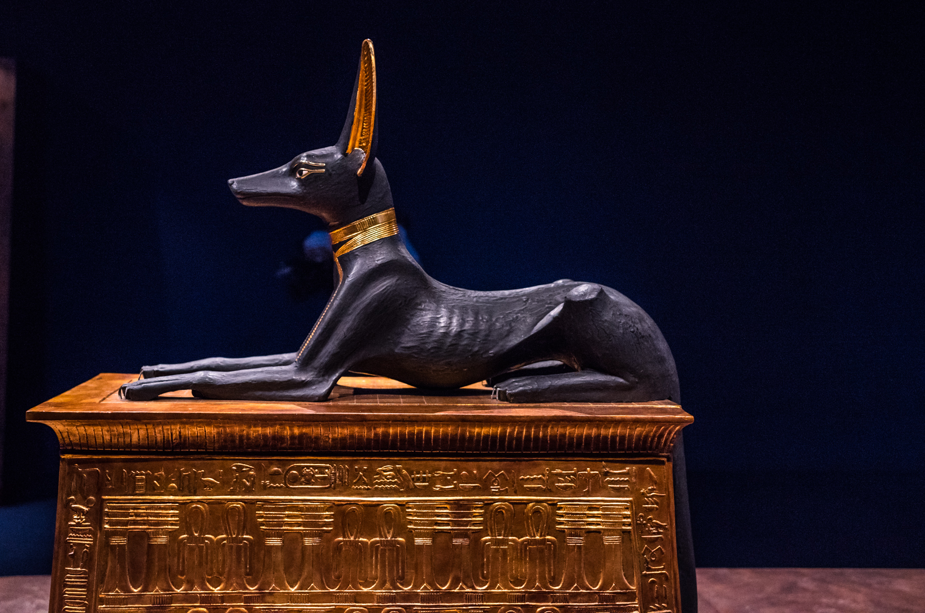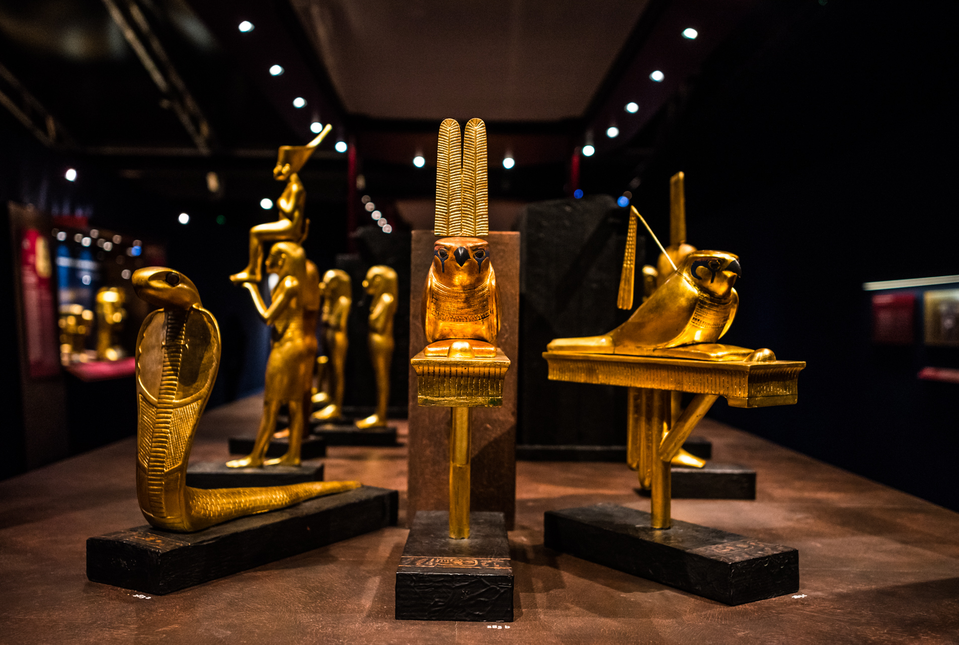 Vista de la reconstrucción de la cámara del tesoro con una escultura de Anubis y una capilla canópica dorada.