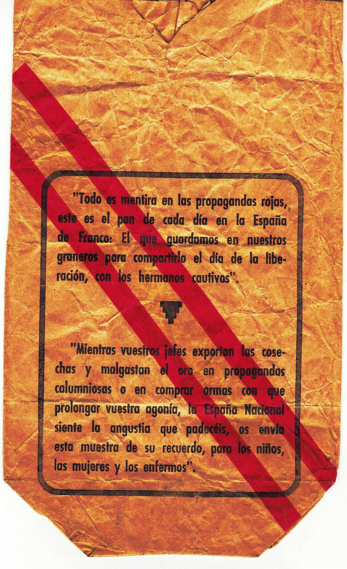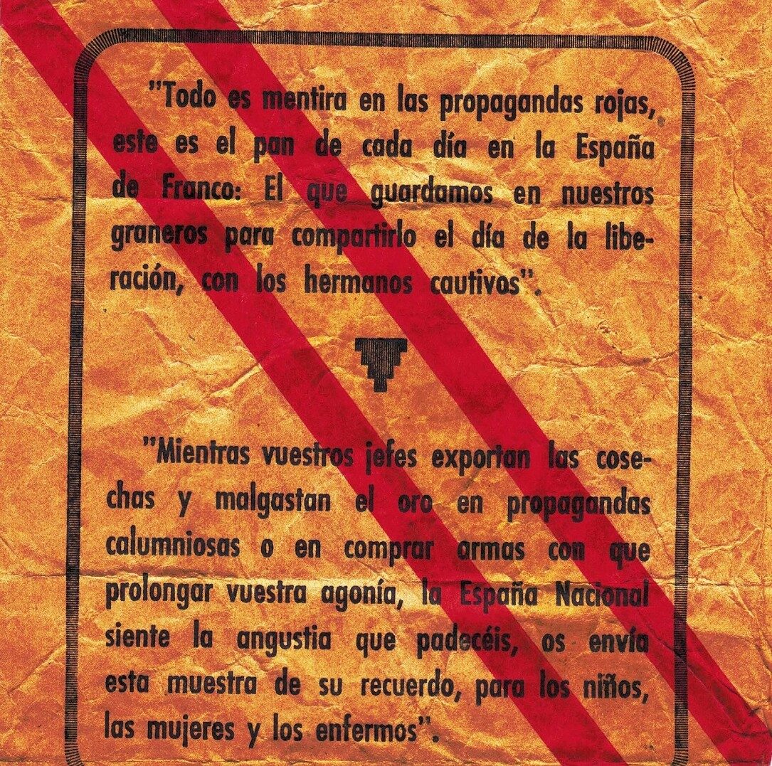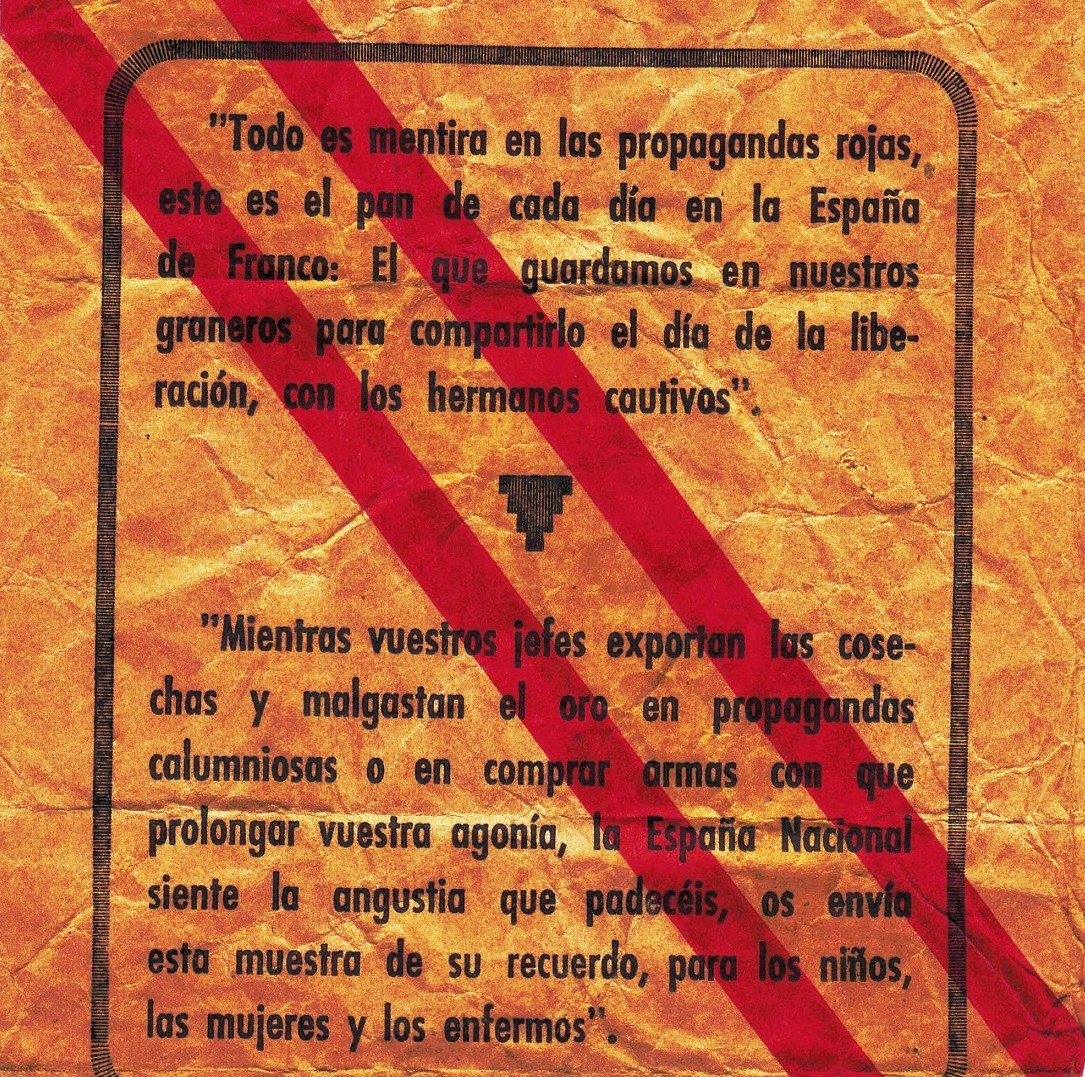 "Mientras vuestros jefes exportan las cosechas y malgastan el oro en propagandas calumniosas o en comprar armas con que prolongar vuestra agonía, la España Nacional siente la angustia que padecéis, os envía esta muestra de su recuerdo, para los niños, las mujeres y los enfermos"