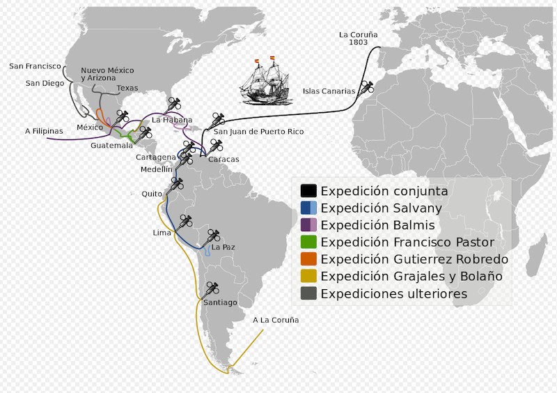 Su primera escala fue en Santa Cruz de Tenerife. De Canarias, fueron al Caribe. En Caracas, el 8 de mayo de 1804 la Expedición se dividió. Balmis y sus compañeros, con Zendal, se desplazaron por el virreinato de Nueva España y después atravesaron el Pacífico en el galeón de Manila, la ruta transoceánica más larga del mundo. Zarparon de Acapulco el 7 de febrero de 1805 en el Magallanes (menuda casualidad) y arribaron a la capital de las Filipinas el 15 de abril.