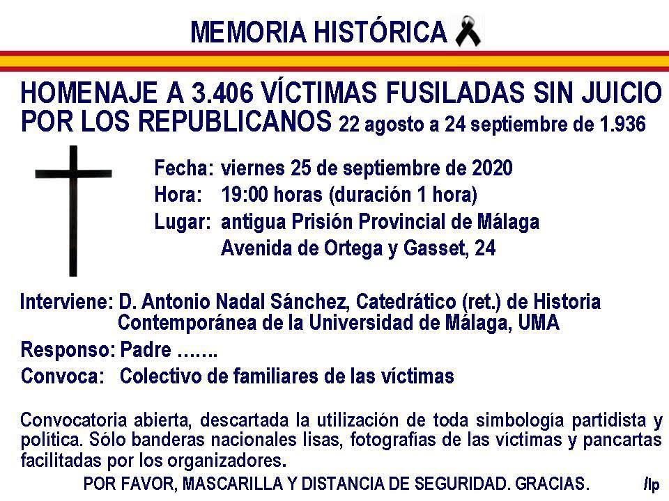 Este próximo día 25 de septiembre tendrá lugar el homenaje a las 270 víctimas de la "saca" de la vieja cárcel de san Rafael de Málaga entre el 22 de agosto y el 24 de septiembre de 1936 y, por extensión y decisión, a las 3.406 personas civiles, religiosas y militares, vinculadas o relacionadas con las derechas y el bando nacional, muertas en la provincia de Málaga durante el mandato de los gobernantes republicanos.