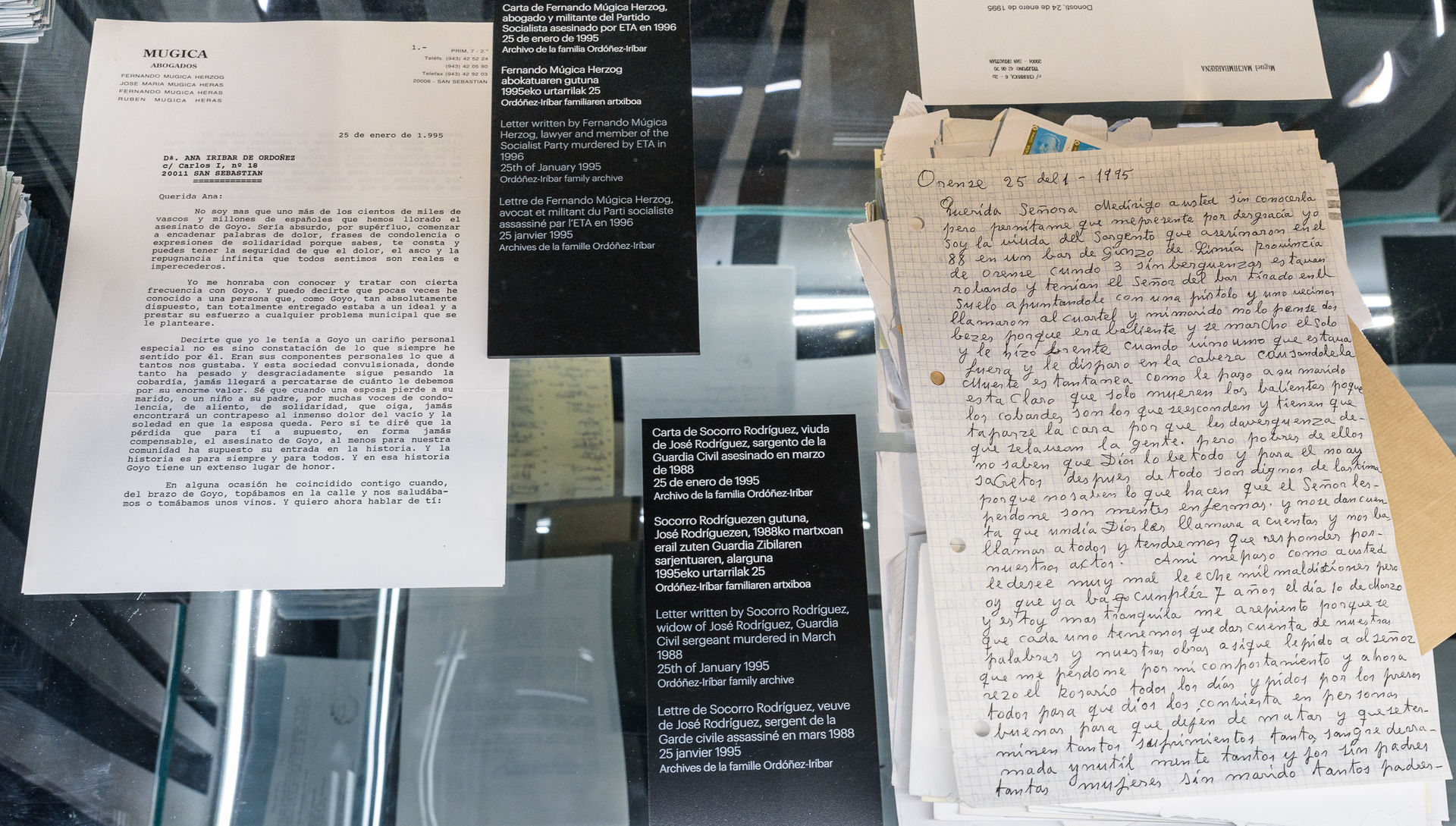 Dos cartas recibidas por la viuda de Ordóñez con un especial significado: a la derecha la de una mujer cuyo marido había sido asesinado, a la izquierda la de Fernando Múgica Herzog, que también sería asesinado por ETA justo un año después.