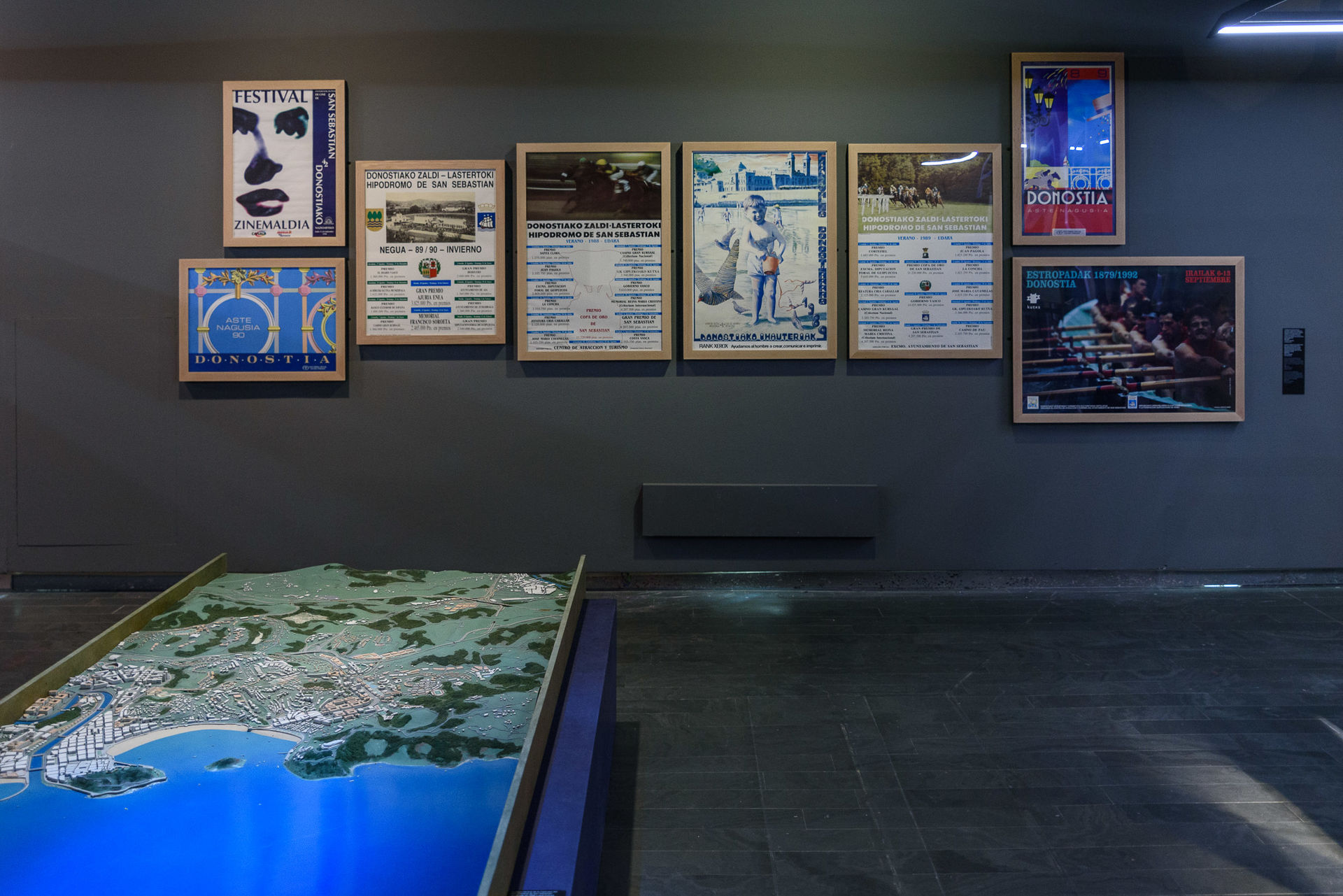 En la maqueta de la izquierda parte el plan urbanístico de San Sebastián en el que Ordóñez realizó importantes aportaciones; al fondo carteles de eventos celebrados cuando era uno de los responsables del área de Turismo de la ciudad.
