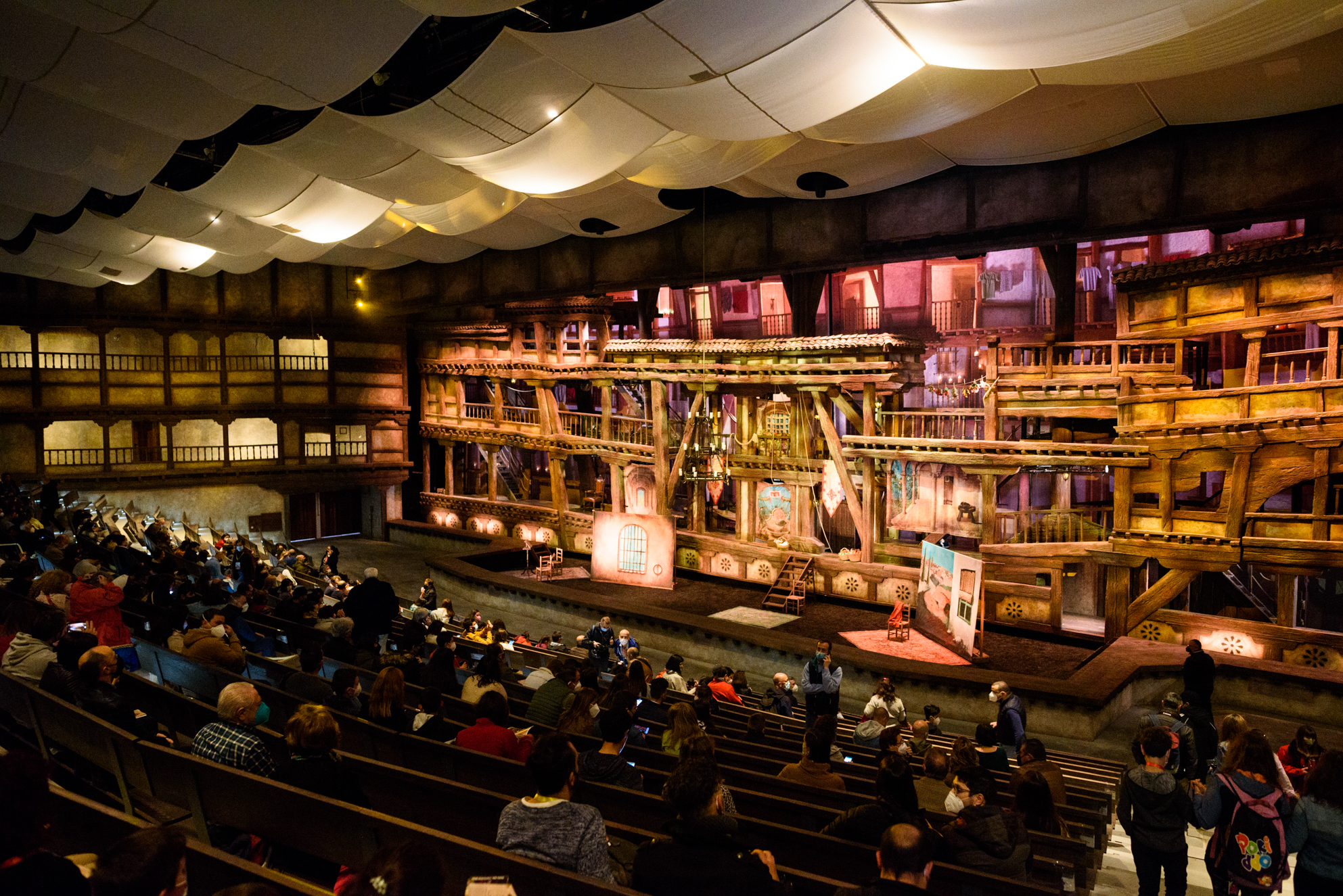 El impresionante escenario donde se representa la obra 'A pluma y espada', imitando un gran corral de comedias, aunque eso sólo es la primera capa.