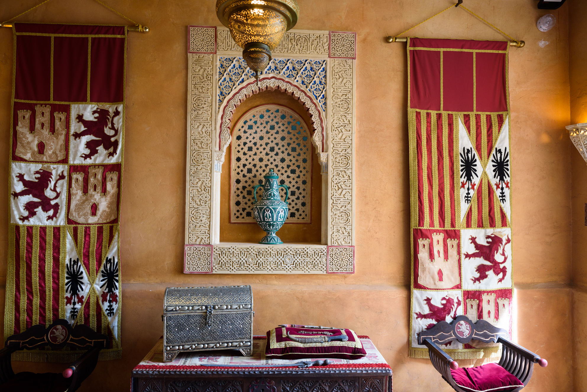 La heráldica y los escudos de armas del Reino de Castilla y otros reinos de la dilatada historia española están perfectamente representados en el interior de los edificios del parque.