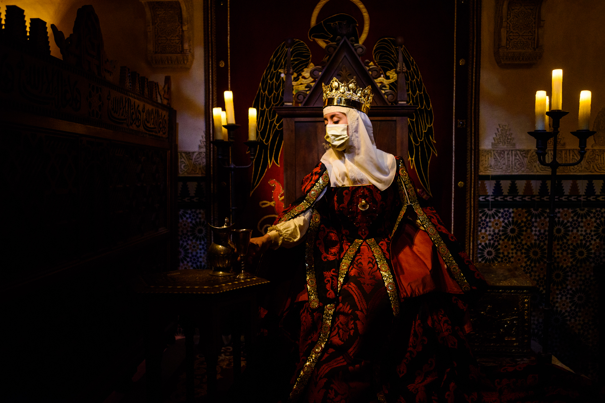 Una actriz caracterizada casi a la perfección como la reina Isabel la Católica (con su mascarilla correspondiente) da la bienvenida a los visitantes de 'Allende la mar Océana'. Granada es ya cristiana y la última entrevista de Cristóbal Colón con la reina Isabel da un giro inesperado: Castilla pagará la aventurada expedición.