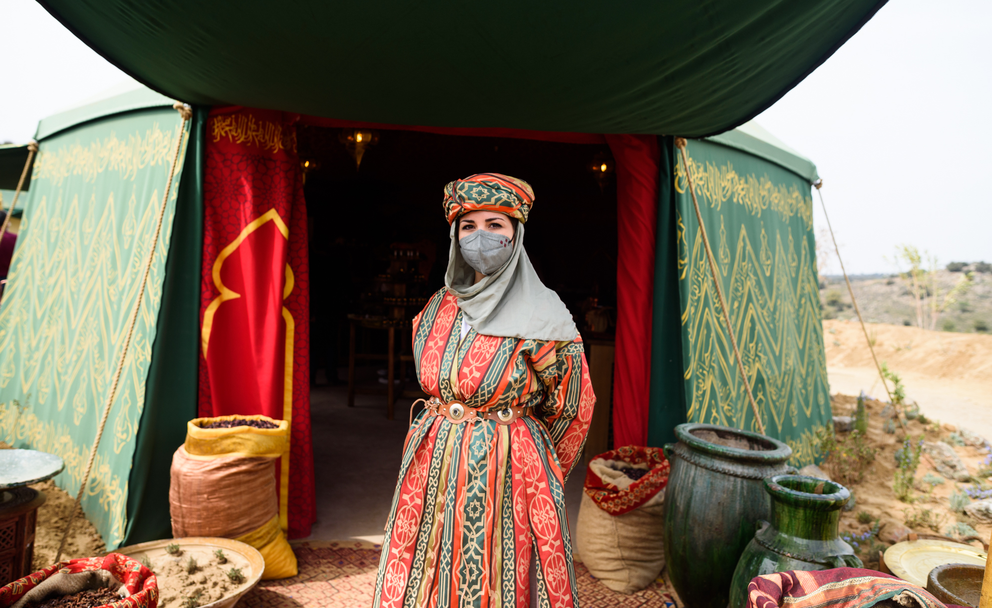 Una figurante y tendera posa para la cámara en una de las jaimas del poblado andalusí El Askar.
