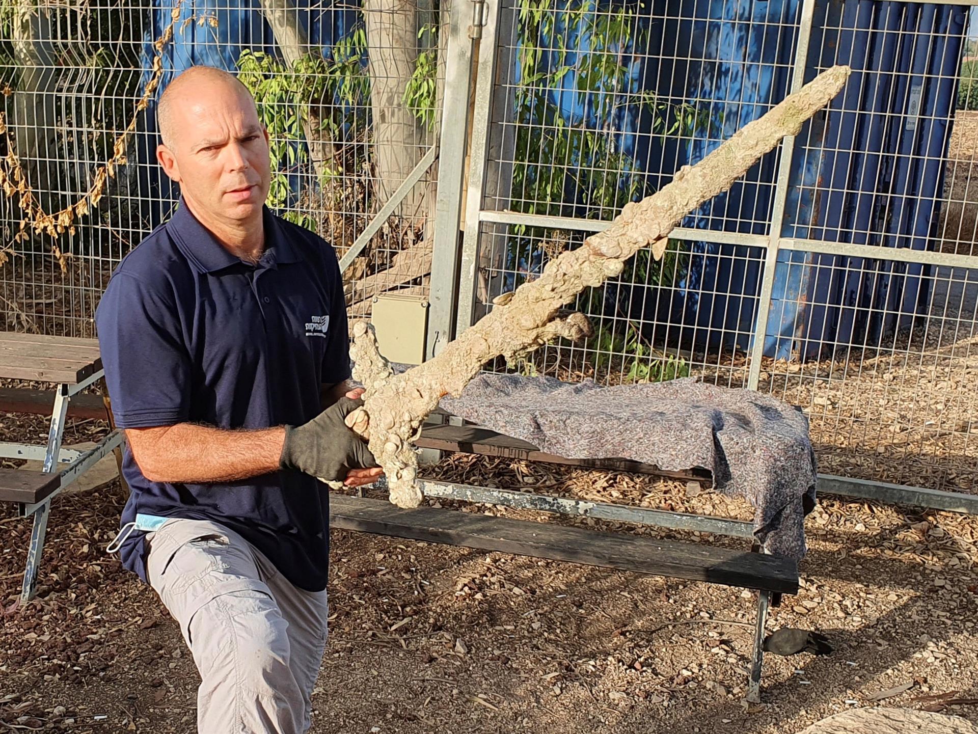 Posee incrustaciones de organismos marinos en la hoja, empuñadura y mango de un metro de largo. Se encontró en una cala cerca de la ciudad portuaria israelí de Haifa. Eso hace pensar al director de Arqueología Marina que pudo servir como refugio para la gente del mar. "Trato de imaginar al caballero de las cruzadas que probablemente luchó con toda la armadura y espada. Es increíble", reconoce. Se calcula que esta pesada espada de hierro tiene 900 años. Se limpiará y se restaurará para después exhibirla.