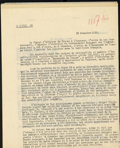 "El mismo día en que se produjo el incidente –señalaba la carta de Álvarez del Vayo– y unas horas después del mismo, el aeródromo de Alcalá de Henares era atacado por los aviones rebeldes, aviones de bombardeo y de caza, entre los que indudablemente se hallaba el agresor del avión de la Embajada francesa. Una hora antes, los aviones rebeldes efectuaron un vuelo de reconocimiento en los alrededores de Pastrana".