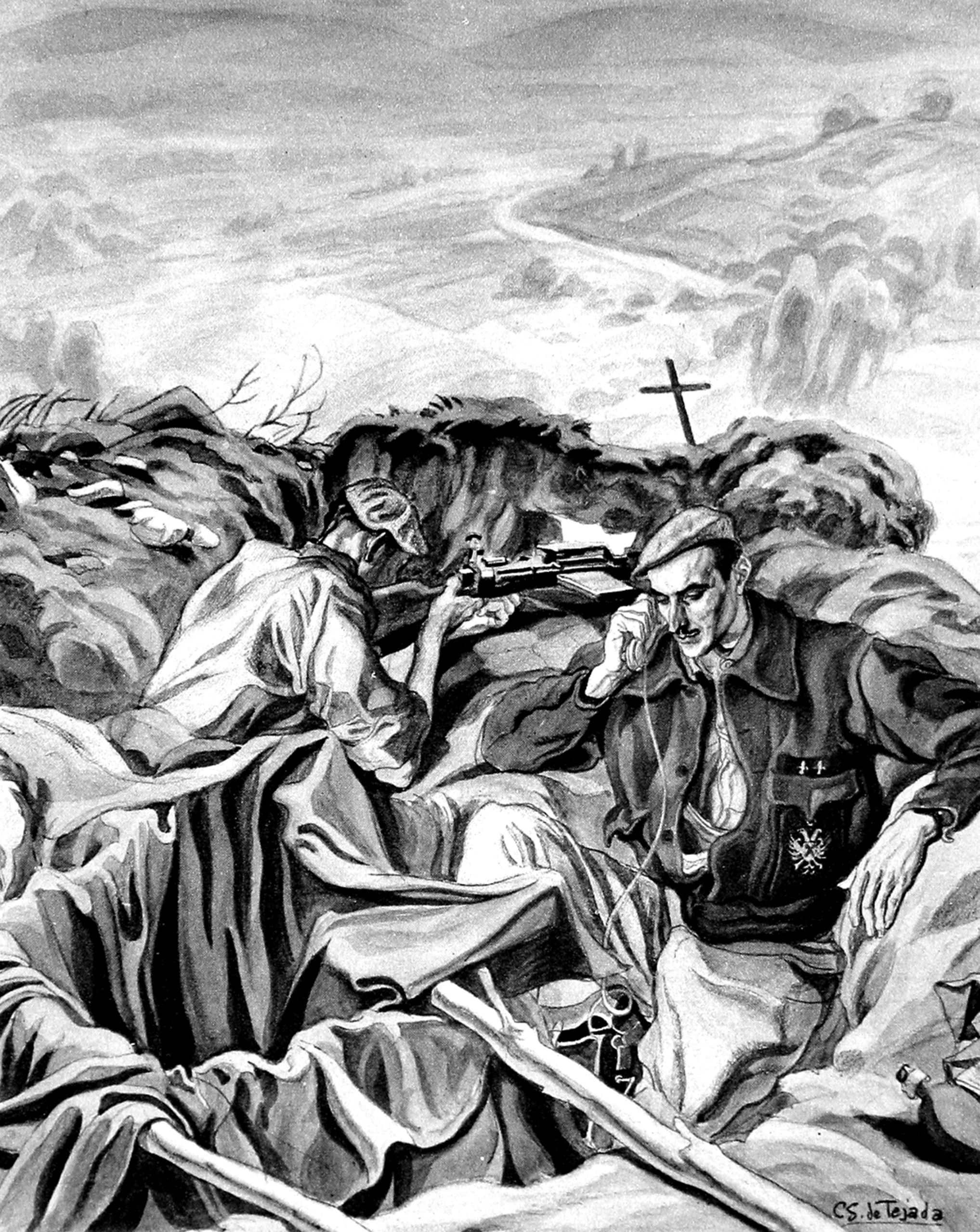 Fueron en torno a sesenta mil jóvenes, muchos de los cuales apenas superaban la edad de alistamiento y que, en lugar de ‘emboscarse’ o esperar la llamada del gobierno, se enrolaban en unidades de combate. Allí rezaban por sus enemigos antes de la batalla y masticaban y tragaban su miedo. Tanto ha cambiado la España por la que derramaron su sangre y sudor que si ellos heredaron de sus padres y abuelos unos testimonios y unos principios que les impulsaron a jugarse la vida, muchos de sus hijos y nietos hoy se han entregado a ideologías que propugnan todo lo contrario. En el acto en que se entregó al Tercio de Montserrat una bandera de gala, celebrado en Barcelona en 1946, la madrina fue Montserrat Sagnier Costa, esposa de José María Milá Camps, conde de Montseny y presidente de la Diputación de Barcelona. Se trata de los abuelos de los periodistas Mercedes y Lorenzo Milá. Donde esta contradicción es más triste es en el caso de los requetés vascos, navarros y catalanes. Las ideologías alucinadas y racistas a las que sirven sus descendientes (y de la que obtienen beneficios del 3% como poco) exigen la desaparición de su recuerdo.