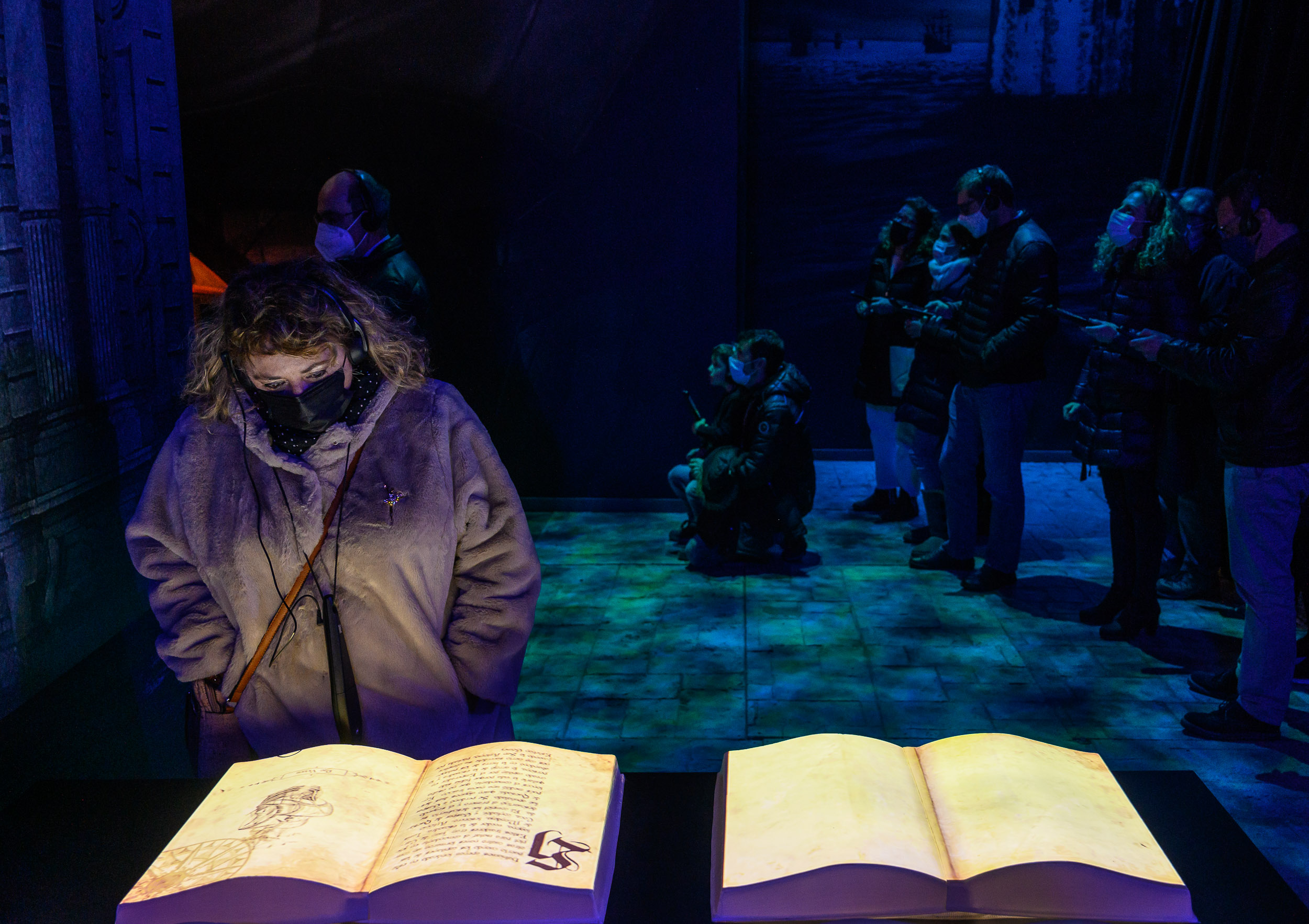 Modernas pantallas reproducen páginas de viejos libros de la época.