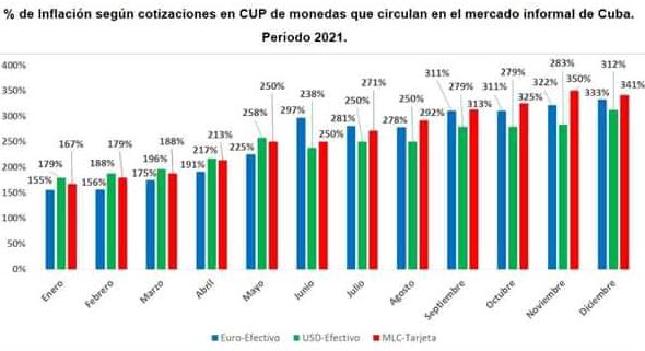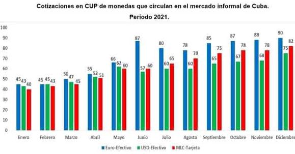Asimismo, el cambio de pesos a MLC se ha puesto por las nubes. "Cuando empieza la tarea ordenamiento está a veinticinco pesos cubanos el CUC (al que sustituyó el MLC)" y "pasado el 2021 y el primer trimestre de 2022, el MLC está a razón de 120 pesos cubanos, cinco veces ha aumentado su valor".