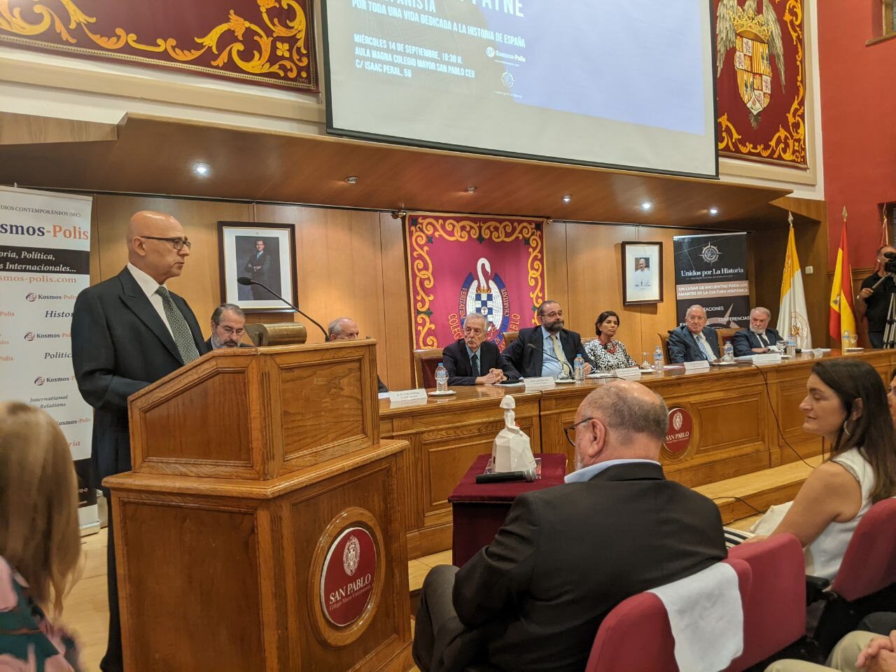 Personalmente es para mí una circunstancia muy feliz la celebración de este importante acto que hoyfinalmente culmina. Debo resaltar que cuando planteamos la convocatoria de este homenaje, todas las instituciones y personas que hoy están participando en el mismo, se sumaron con entusiasmo dando su pleno apoyo. Gracias por ello de corazón. Esto es así, porque hablar de Stanley Payne es hablar de España, de su pasión por nuestra nación, de su Historia Contemporánea, de su historia general, porque Payne forma ya parte de ella, como hemos puesto de relieve en la lectura del manifiesto-convocatoria.