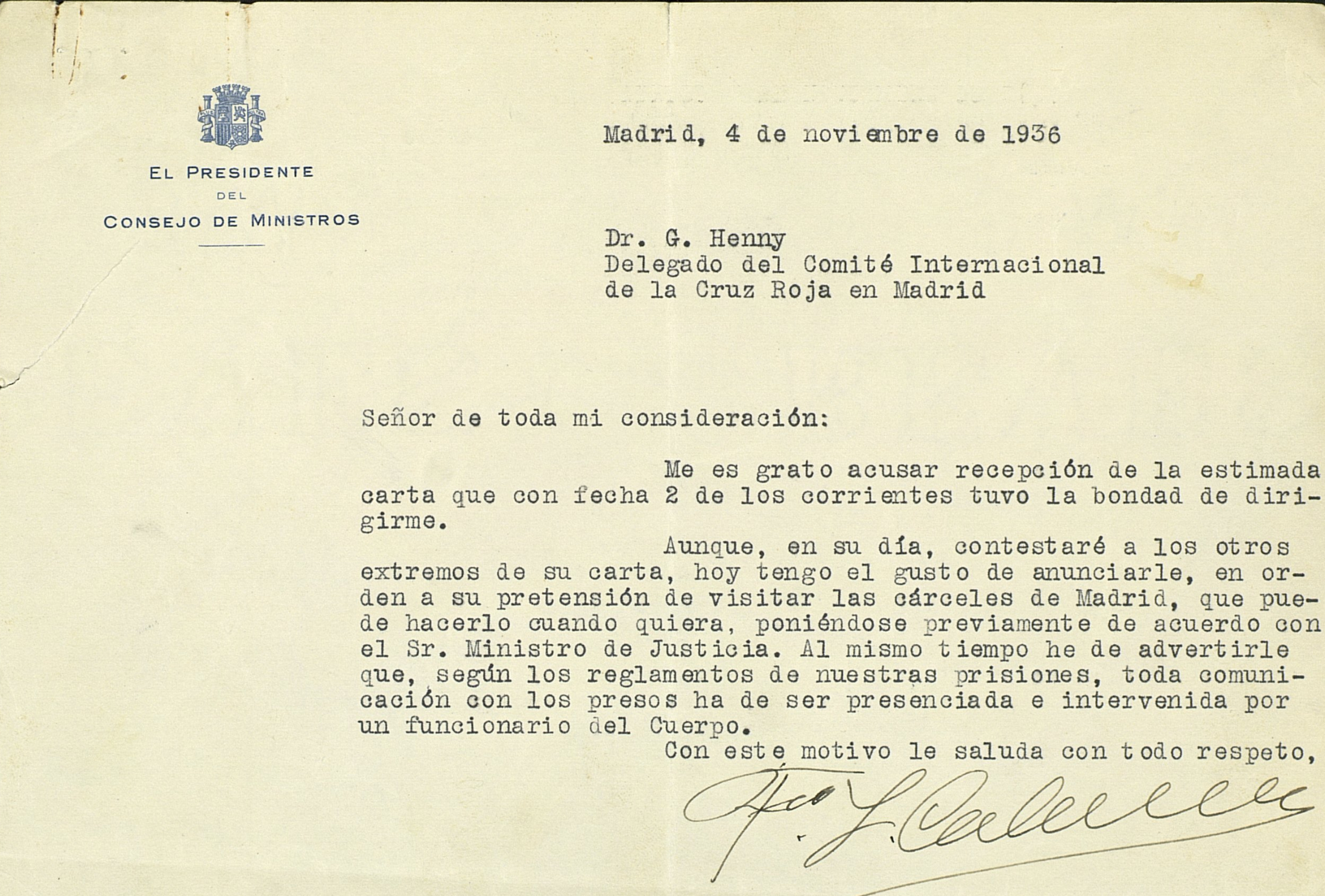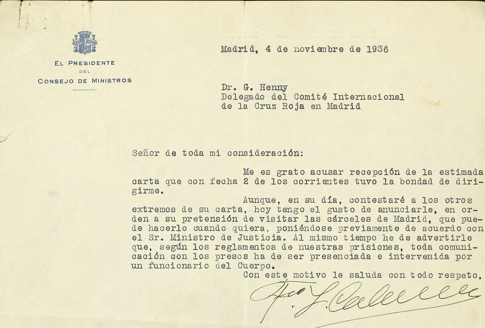 El delegado del CICR recibe enseguida "avisos de prudencia de personas amigas que consideran que tales pasos son muy peligrosos en las circunstancias actuales", como notifica el 24 de octubre a Ginebra con motivo de sus visitas a las prisiones. En este informe, Henny comunica que "ha tenido el honor" de ser recibido ese mismo día por el jefe del gobierno, Francisco Largo Caballero, a quien le pide liberar a las mujeres detenidas en Madrid. El líder socialista rechaza la propuesta porque "considera que todas las mujeres detenidas en Madrid son objeto de información y que en esta ciudad no hay rehenes". (11)