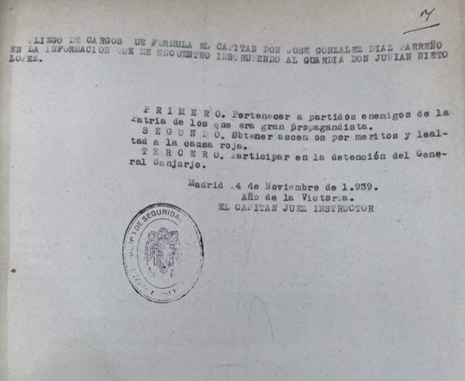 En noviembre de 1939, Julián Nieto fue separado del Cuerpo de Seguridad y puesto a disposición del Auditor de Guerra para la posible apertura de causa por auxilio a la rebelión. En favor suyo declararon un compañero detenido por el Servicio de Información Militar republicano, el cabo José Sebastián Rivera, que aseguró que todas sus manifestaciones eran "de condena de los desmanes de la horda roja". Otro guardia, Félix Ortega, aunque le señalaba como "rojo", reconoció que "no amenazó ni denunció a ningún compañero".