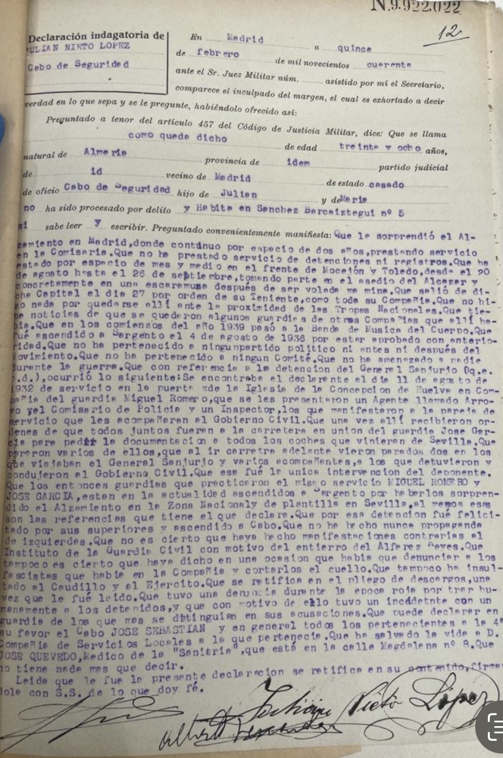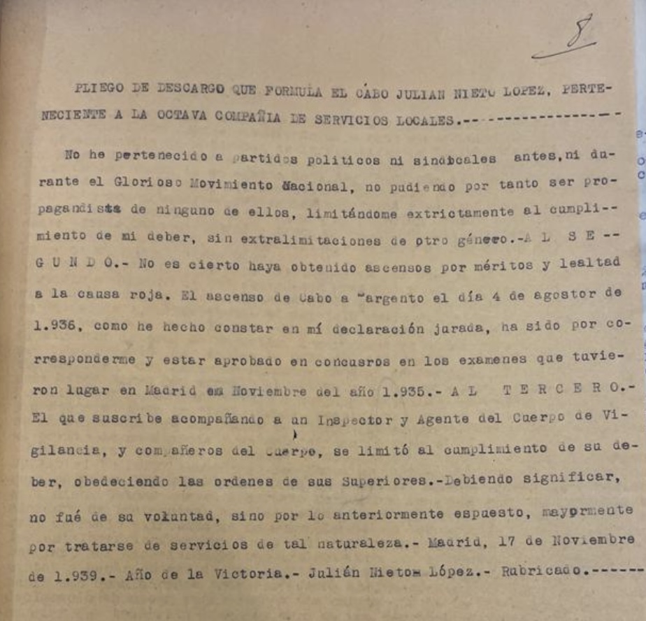 [8] Diligencias previas contra Julián Nieto López, 24 de enero de 1940, Archivo General e Histórico de la Defensa, 23921, 1940, Madrid, 1873/13.