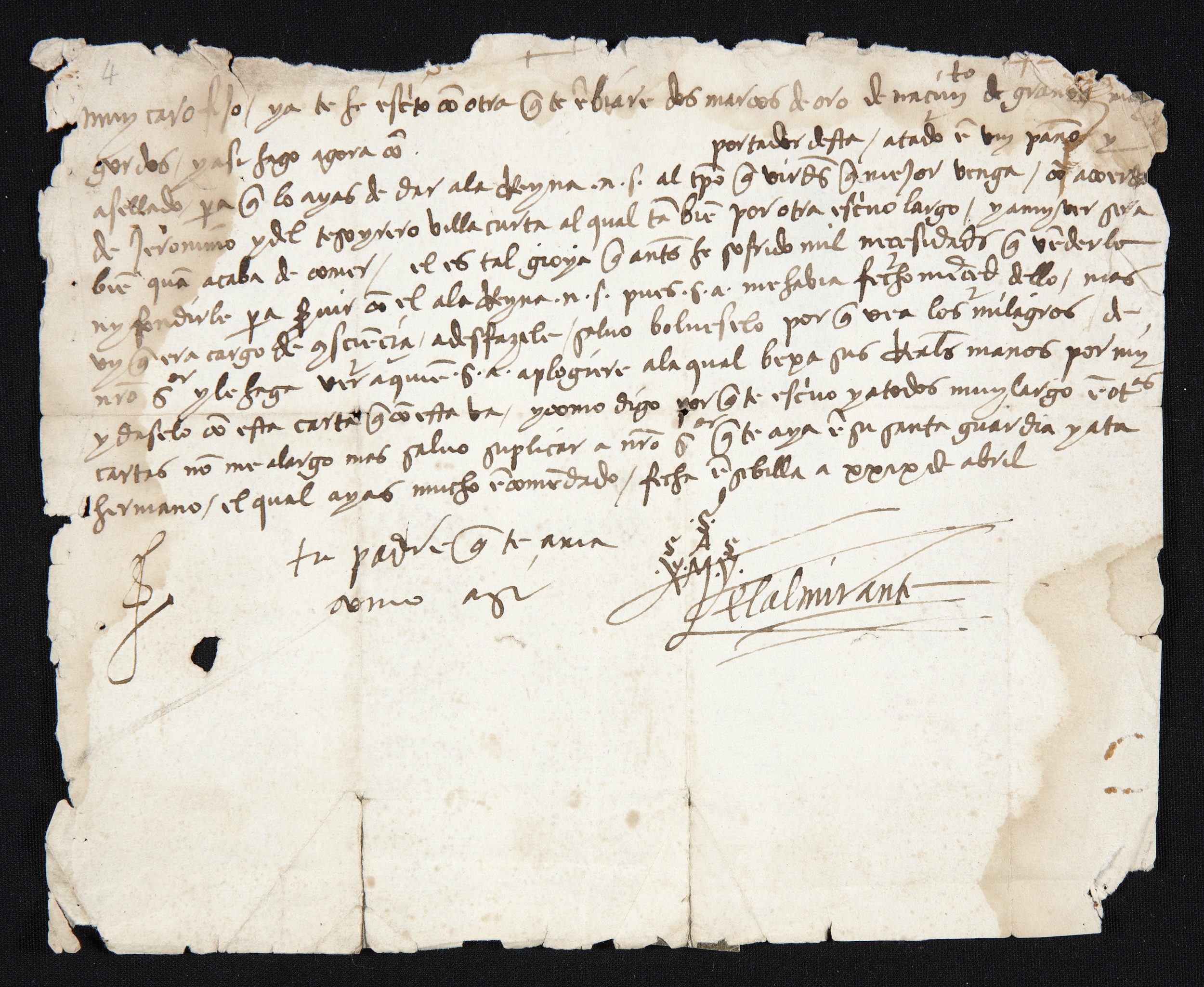 El Palacio de Liria conserva el Rol de marineros del primer viaje, que recoge la nómina detallada de los tripulantes que se enrolaron en 1492; el autógrafo más antiguo que ha llegado hasta nosotros; siete de las once cartas que envió a su amigo fray Gaspar de Gorricio | Imagen: Carta autógrafas de Cristóbal Colón a Fray Gaspar de Gorricio, monje en el monasterio de las Cuevas, 1498-1501.