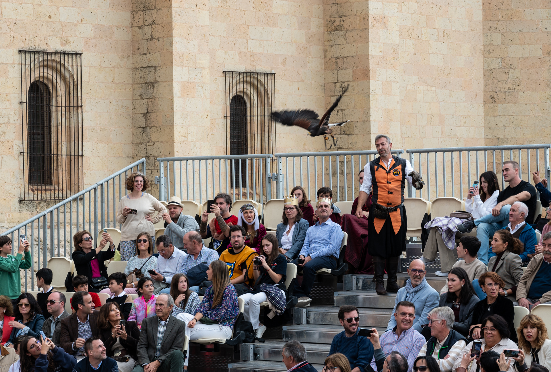 Allí se ha iniciado la recreación histórica con una exhibición de cetrería y piezas musicales interpretadas con laúdes, chirimías y tambores, que han dado paso al relato en el que el bufón de la corte, como un moderno presentador, explicaba al público el contexto de la proclamación de Isabel. Por la obra han pasado los personajes de Diego de Quintanilla, Juan Díez de Alcocer, Diego de Avellaneda o el corregidor de Segovia, Andrés de Cabrera.