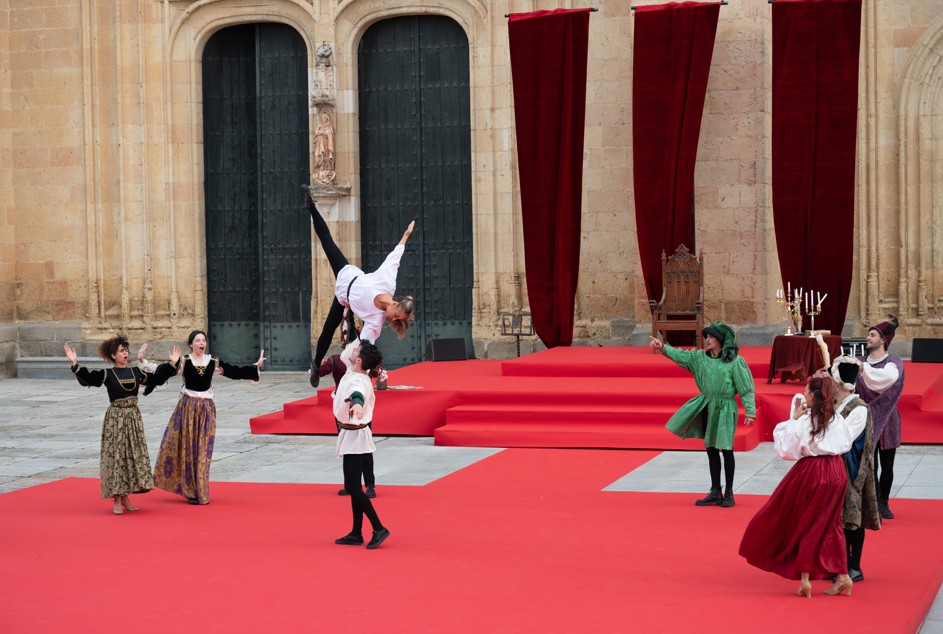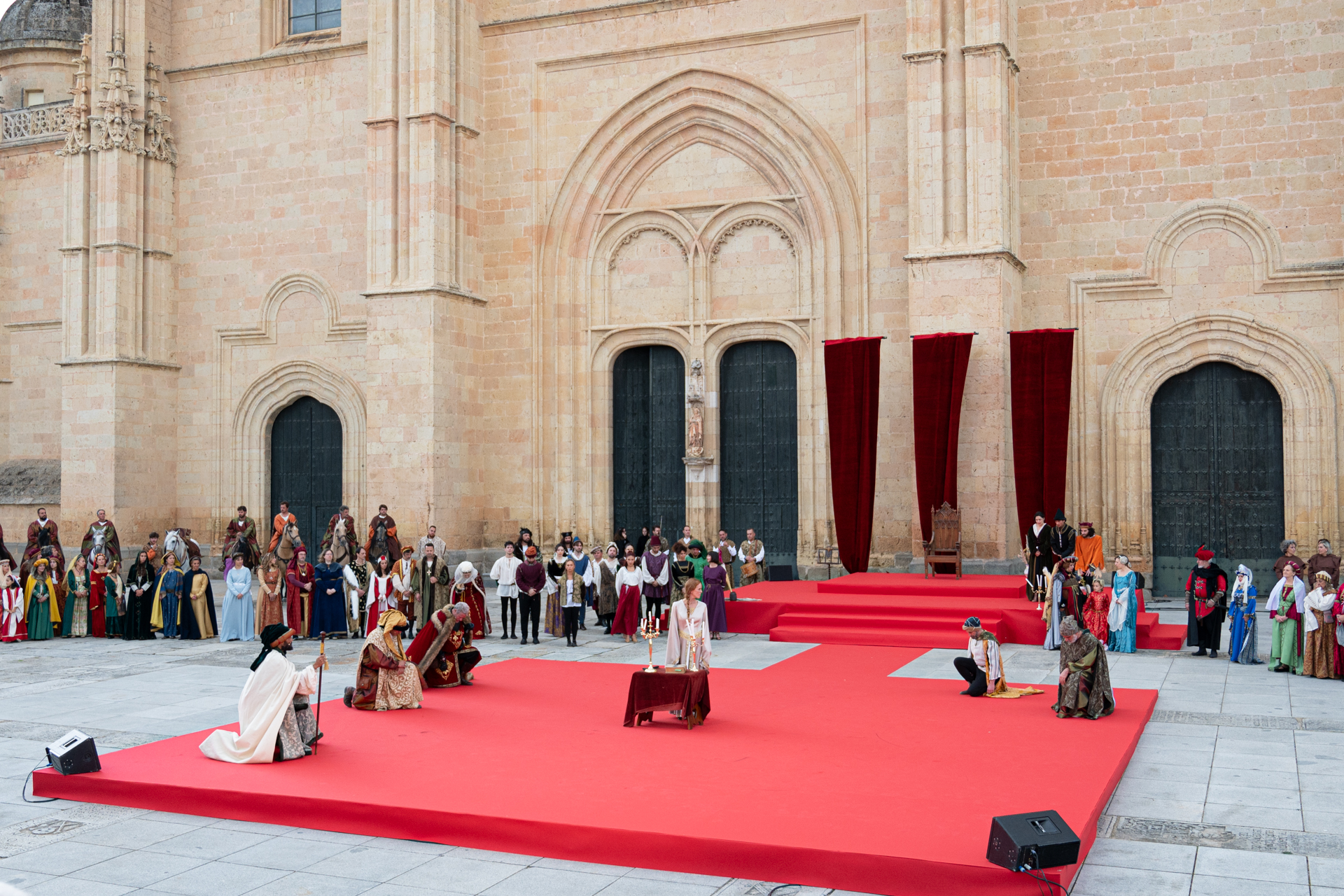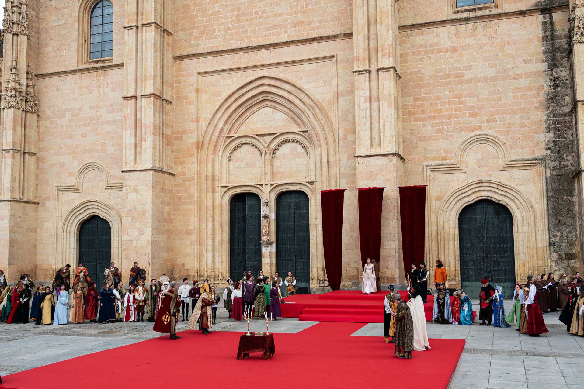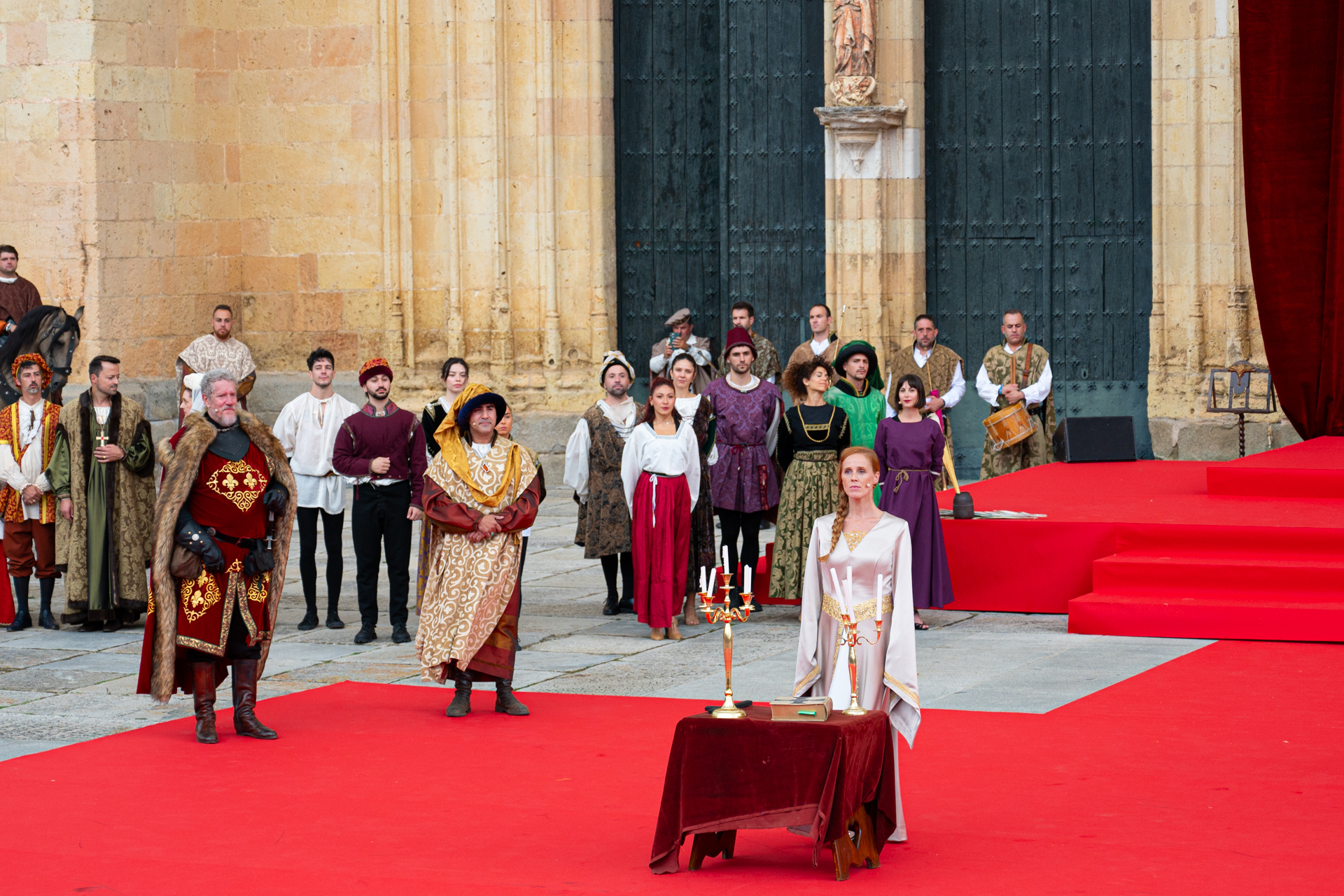 Tras recitar algunos pasajes históricos de cronistas que reflejaron aquella proclamación, María Castro y el resto de actores y figurantes se han encaminado al enlosado de la Catedral, habilitado con gradas para dar cabida a 700 espectadores.