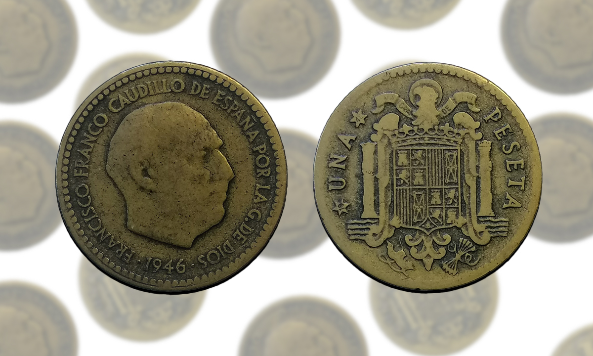Esta peseta pertenece al año 1946 y tiene el busto de Franco dibujado. ¿Por qué resulta tan especial? Hasta el año 1946 las acuñaciones realizadas no reflejaban la cara del dictador, debido a la oposición occidental al régimen franquista. Por el contrario, se usaban símbolos del régimen como el águila del escudo, el jinete ibérico o el yugo y las flechas.