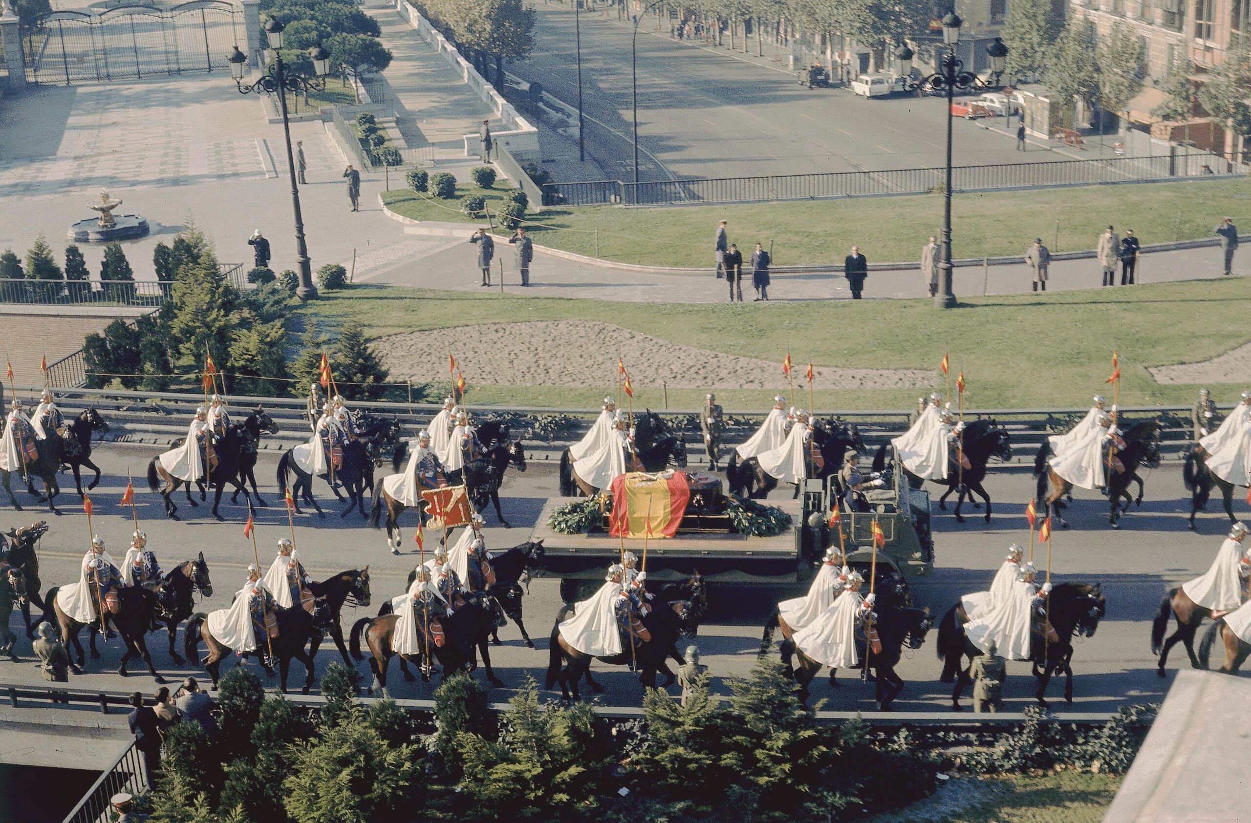 El furgón mortuorio tomó rumbo al Palacio del Pardo. Al día siguiente se abrió la capilla ardiente en el Palacio Real. Miles de españoles (alrededor de medio millón según fuentes oficiales; la cifra fue elevada por otras) en interminables filas que partían desde la Puerta del Sol, dieron la despedida ante el féretro abierto con los restos de Franco, con uniforme de Capitán General, entre lágrimas de muchos y expresiones de dolor, e incluso con algún desmayo. El 23 de noviembre se procedió al multitudinario entierro en el Valle de los Caídos, bajo una losa de mil quinientos kilos de granito.