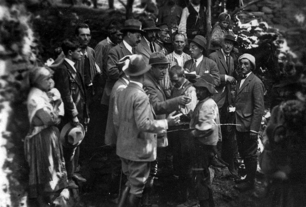 Alfonso, Promotores del acto de presentación de la Agrupación al Servicio de la República en el Teatro Juan Bravo de Segovia, 14 de febrero de 1931. De Izquierda a derecha, Antonio Machado, Gregorio Marañón, José Ortega y Gasset y Ramón Pérez de Ayala. MECD, AGA, Fondo "Archivo Fotográfico Alfonso".