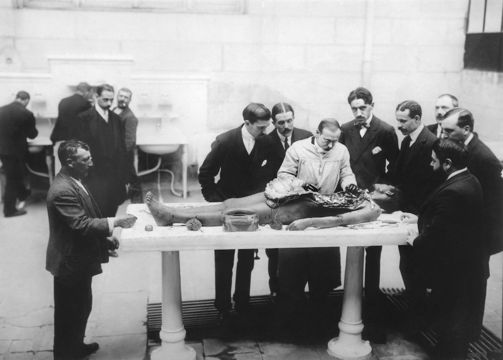 El doctor Gustavo Pittaluga practicando una autopsia en presencia, entre otros de Teófilo Hernando y Gregorio Marañón, hacia 1910.