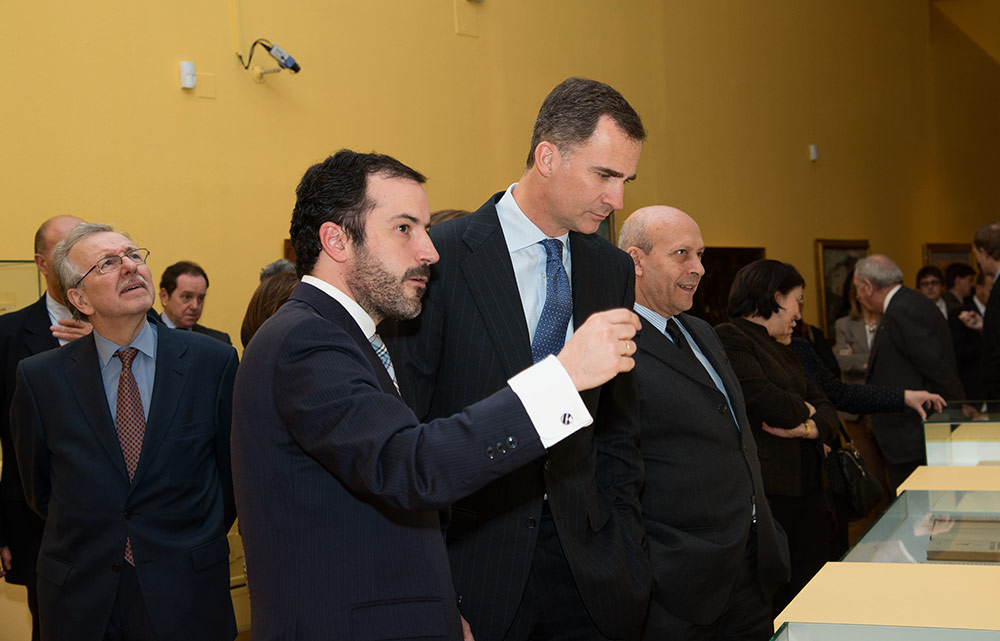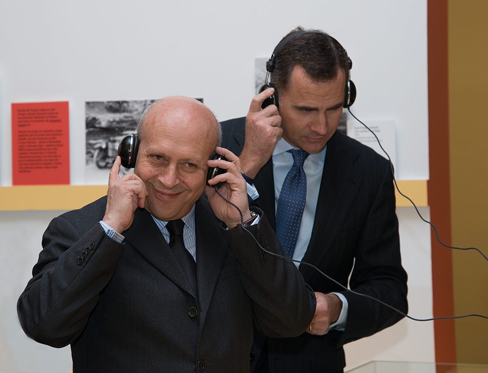 El príncipe Felipe y el ministro de Educación, Cultura y Deporte escuchan escuchando una copia de la obra "El orador" de Ramón Gómez de la Serna.