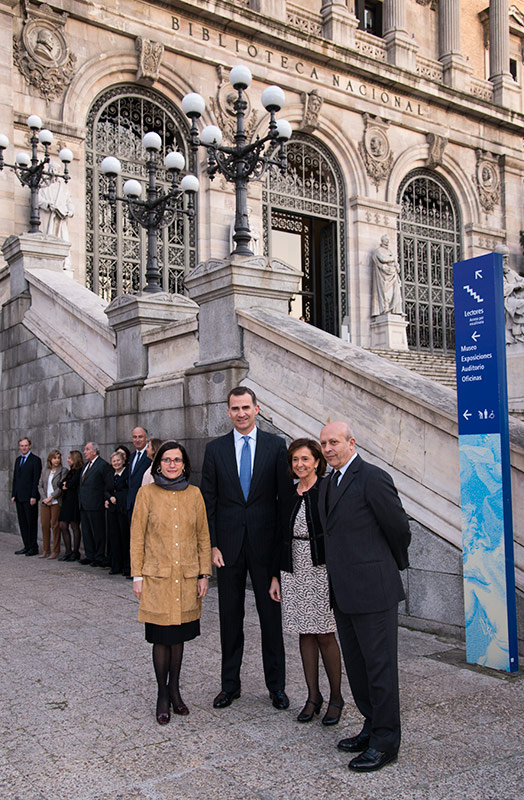 Felipe de Borbón a su llegada a la Biblioteca Nacional de España junto al ministro de Educación, Cultura y Deporte, José Ignacio Wert; la directora de la Biblioteca Nacional de España, Ana Santos y la directora general de Política e Industrias Culturales, Teresa Lizaranzu.