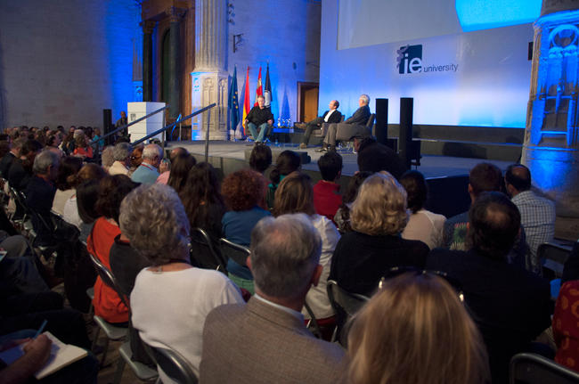 Situar a dos premios Nobel de literatura en la misma sala no es algo habitual. Que conversen sobre su infancia y sus orígenes literarios evocando recuerdos casi olvidados que han marcado sus vidas y sus carreras y que compartan esas experiencias, es ya de por sí un regalo para los centenares de afortunados que abarrotaron la capilla del antiguo monasterio de Santa Cruz la Real, en Segovia, ahora reconvertida en el aula magna del IE University.