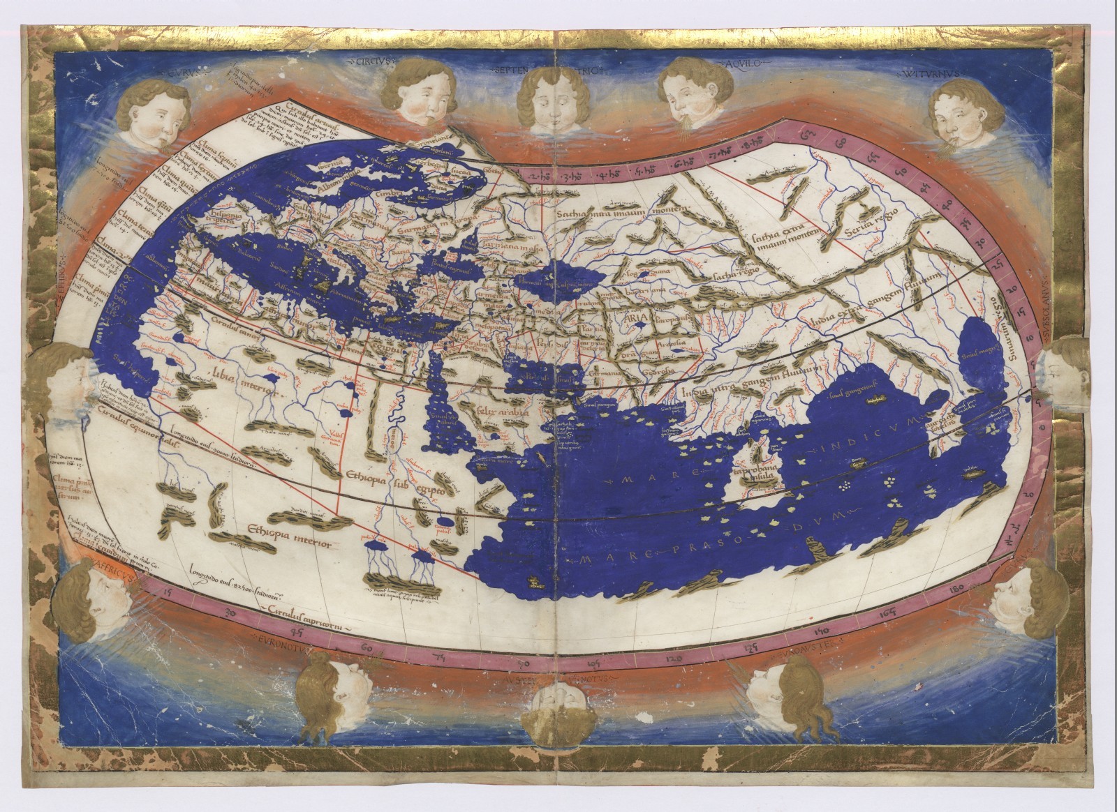 Mapa del mundo de una de las copias más antiguas conocidas de la Geografía de Ptolomeo (s. II d.C.), un listado de topónimos georreferenciados del mundo conocido en su época, fue redescubierta durante el siglo XV y llevada al lenguaje cartográfico, dando lugar a los primeros atlas modernos.