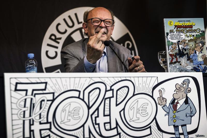 Durante la presentación de la criatura, en el Círculo de Bellas Artes, Ibáñez habla deprisa y feliz. El tesorero sale a la venta este miércoles, y este martes ya tiene una tirada acumulada de 50.000 ejemplares. "No había visto en mi vida una reedición antes de que se publicara un álbum mío", dice. En el cómic se cuelan las preferentes, los individuos que se enriquecieron a costa de la política, el trato de favor a determinadas empresas, nombres y personajes ficticios que recuerdan a los de la vida real –Rojoy o Rubacalva, por ejemplo-.