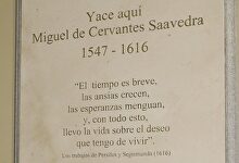 La placa que acompaña el monumento en honor al escritor del Cervantes ha rebautizado una de sus obras más importantes.